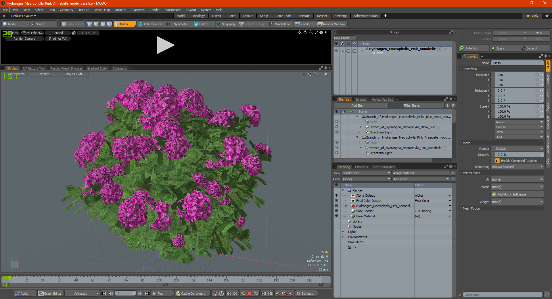 Hydrangea Macrophylla Pink Annabelle is a high quality, photo real 3d model that will enhance detail and realism to any of your rendering projects. The model has a fully textured, detailed design that allows for close-up renders, and was originally modeled in 3ds Max 2020 and rendered with V-Ray. Renders have no postprocessing!
