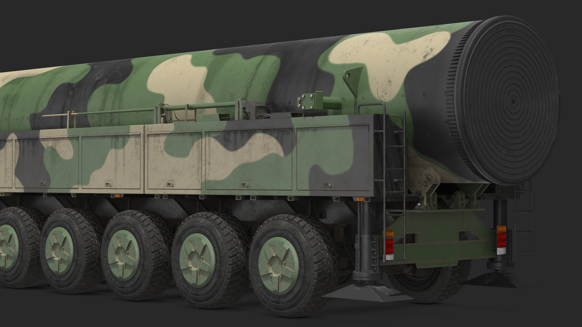 Green camouflage road-mobile transporter erector launcher (TEL) wheeled heavy duty truck vehicle with missile.
