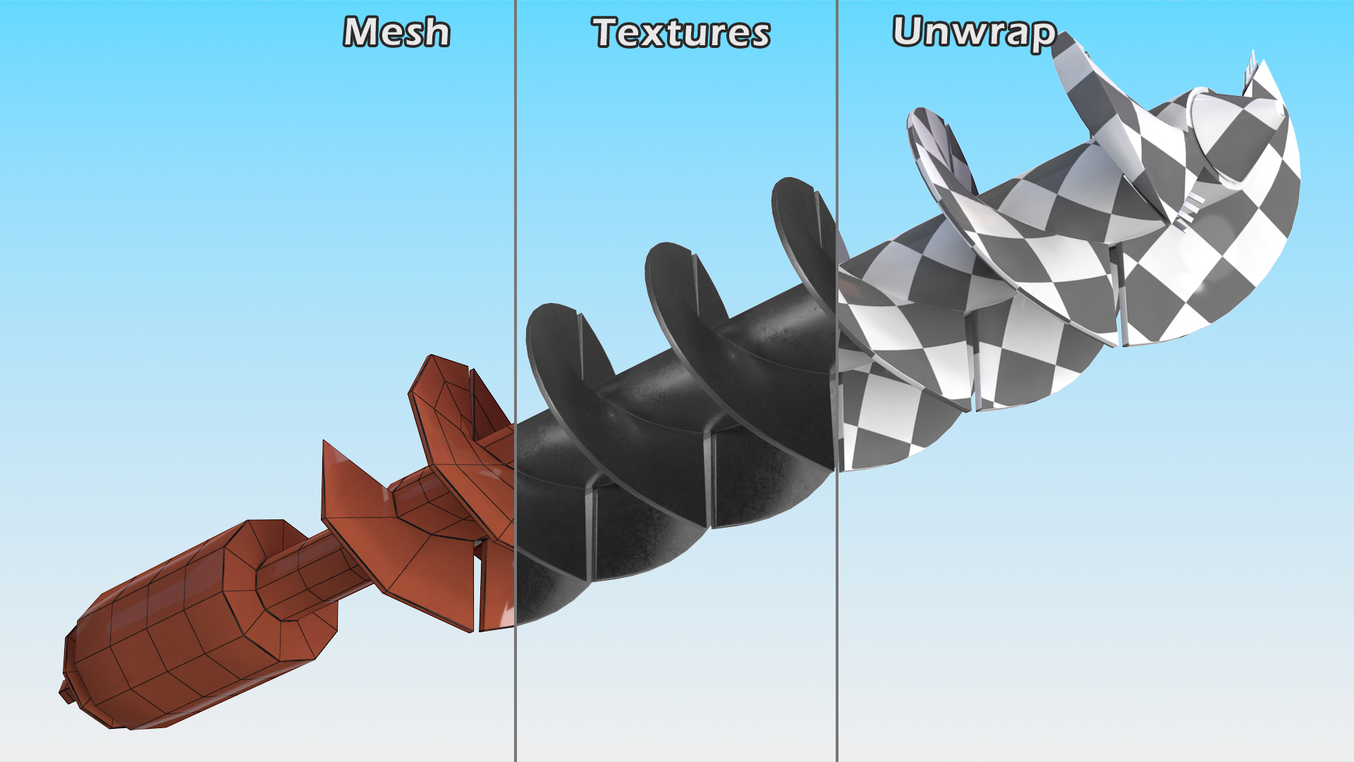 Ice Auger Bit New is a 3D model of metal drilling tool which designed for making round (cylindrical) holes in the water ice material (frozen water).