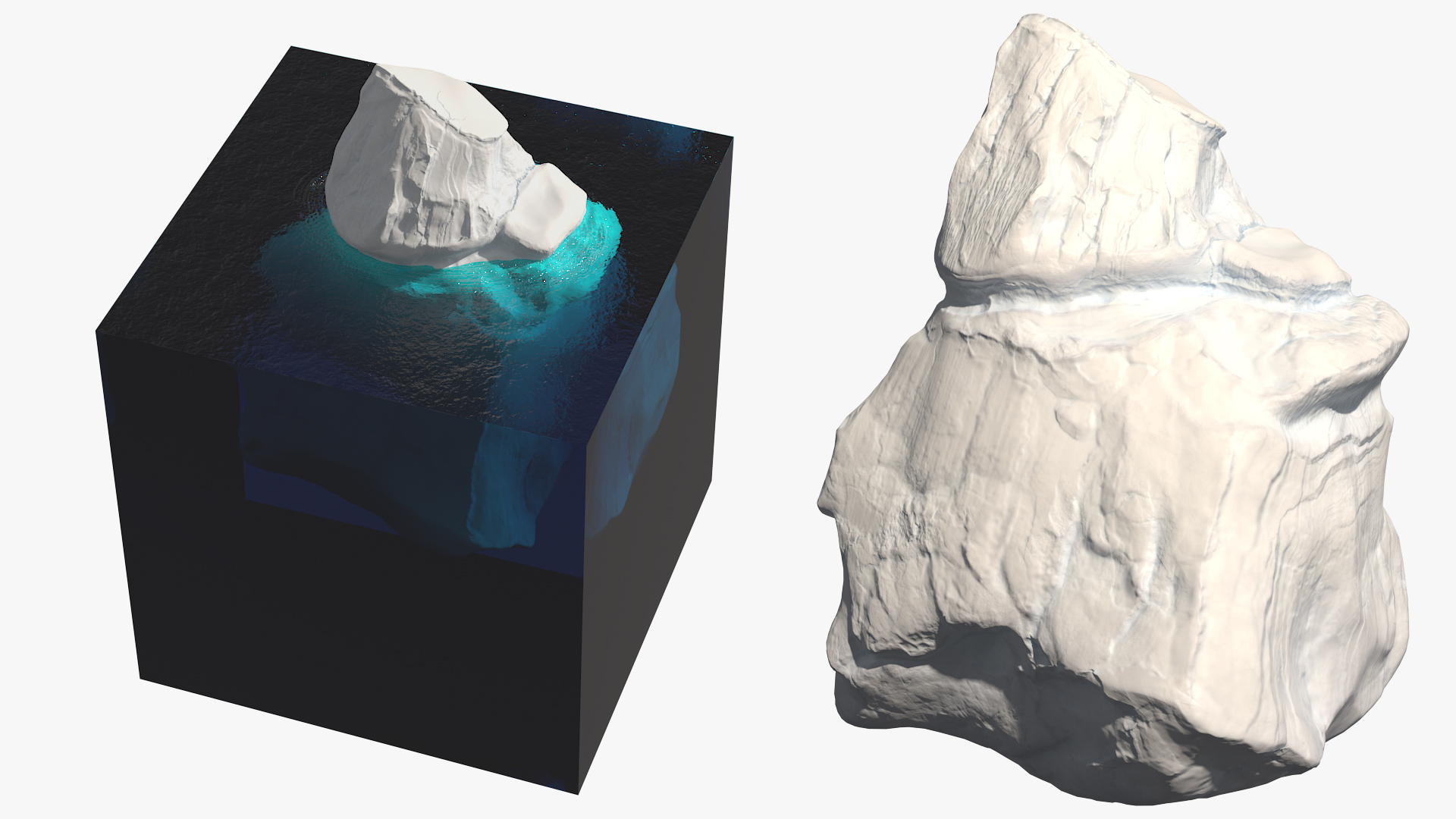 Iceberg is a three-dimensional model of a large piece of floating freshwater ice in ocean or sea water.