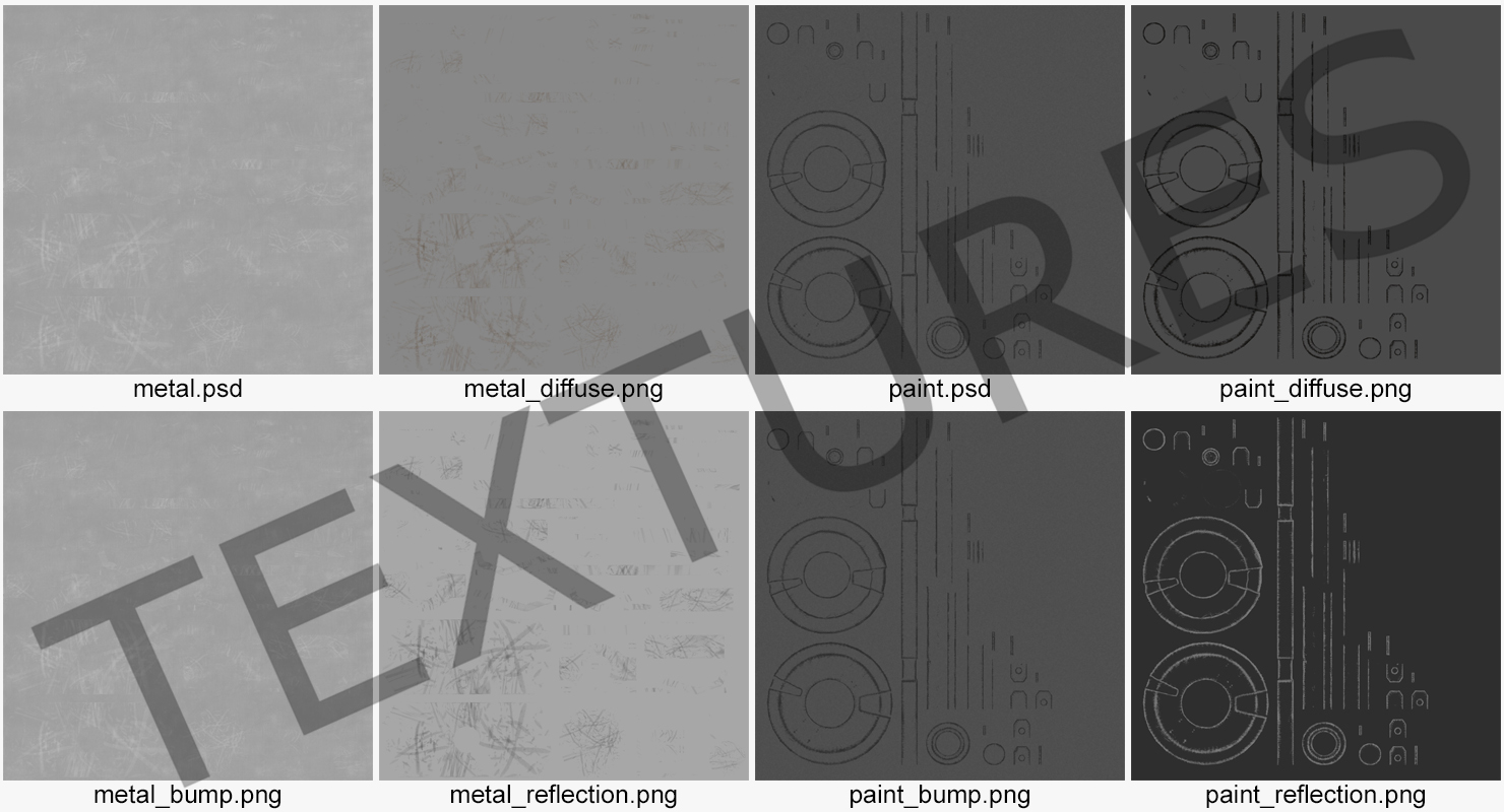 All textures and materials are included and mapped. (All colors can be easily modified.)