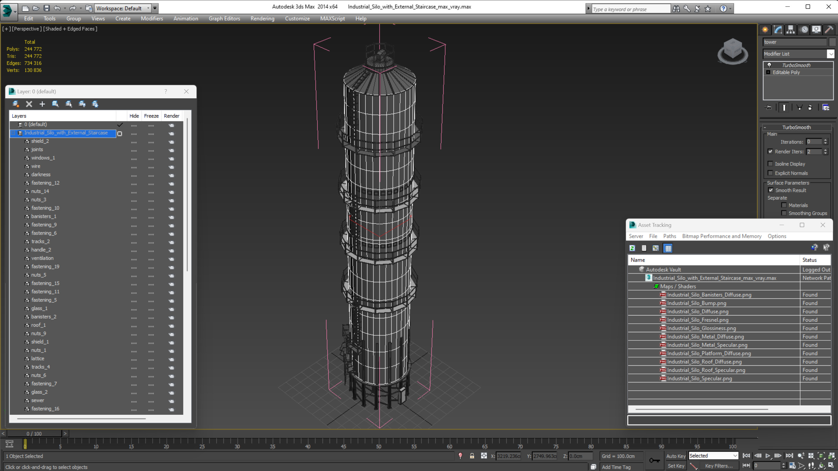 This detailed model showcases the cylindrical shape of the silo, with a robust external staircase spiraling up the structure. The model accurately represents the steel construction, safety railings, and support structures, providing a realistic and functional visualization.