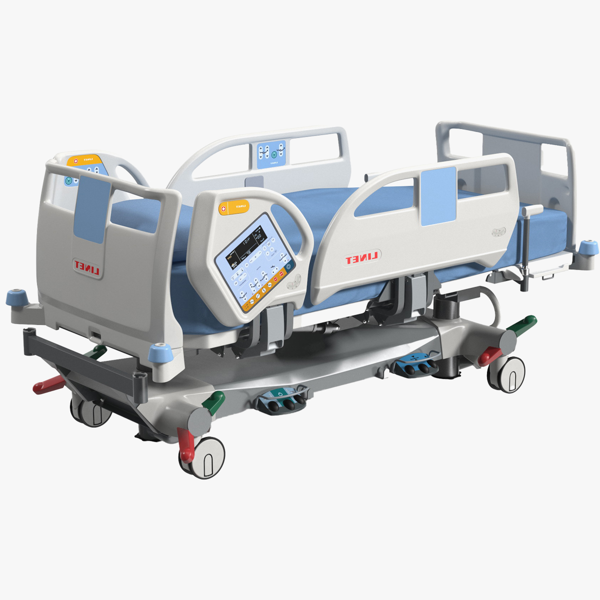 An intensive care bed which is a crucial component of modern healthcare facilities, offering comprehensive support for patients requiring intensive medical attention. Engineered with cutting-edge technology, it enables healthcare professionals to monitor and manage patients effectively. Its intuitive controls and customizable features facilitate personalized care, promoting better patient outcomes and comfort during critical phases of treatment.