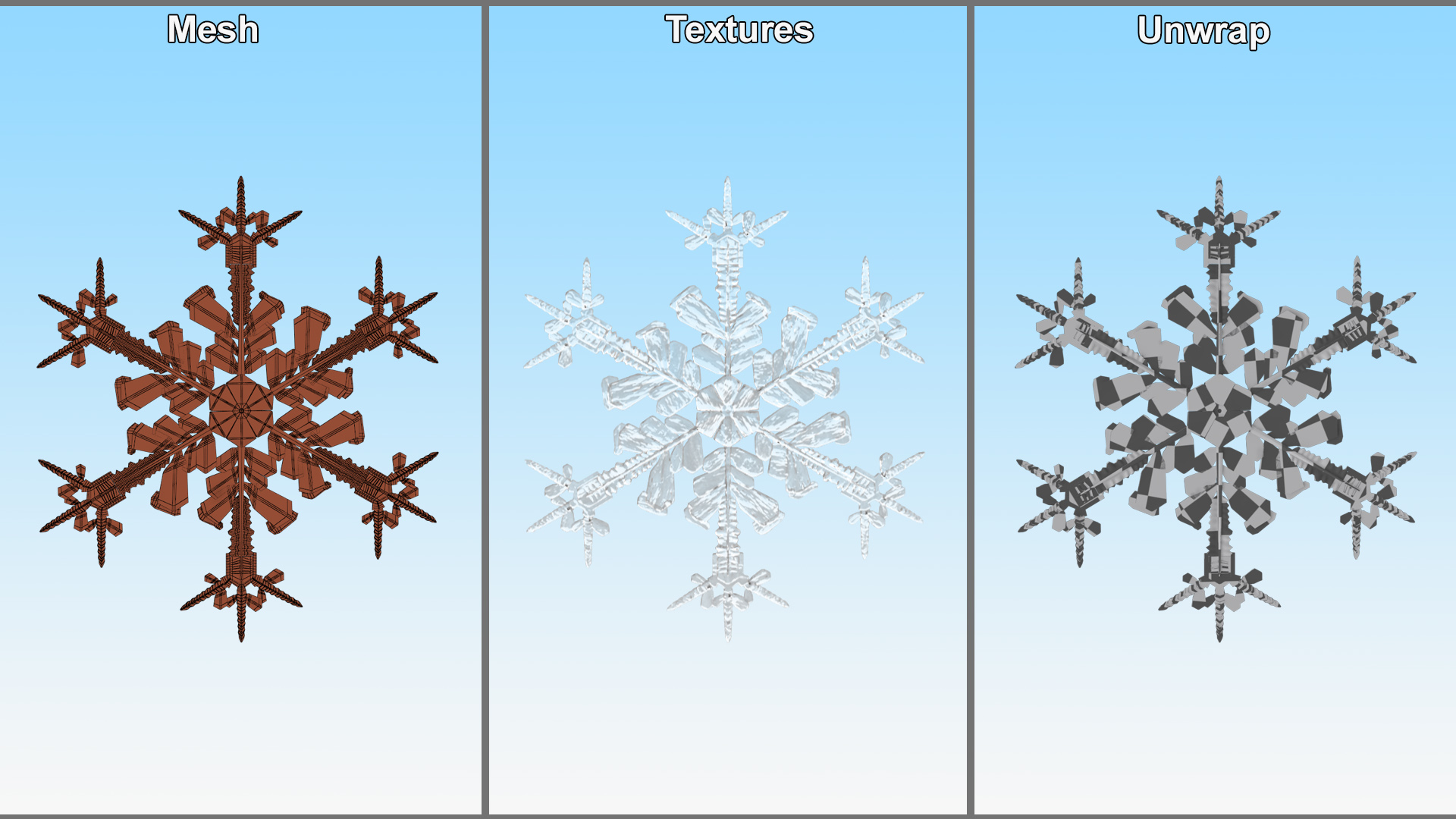 Intricate Snowflake is a high quality, photo real 3d model that will enhance detail and realism to any of your rendering projects. The model has a fully textured, detailed design that allows for close-up renders, and was originally modeled in 3ds Max 2020 and rendered with V-Ray. Renders have no postprocessing!