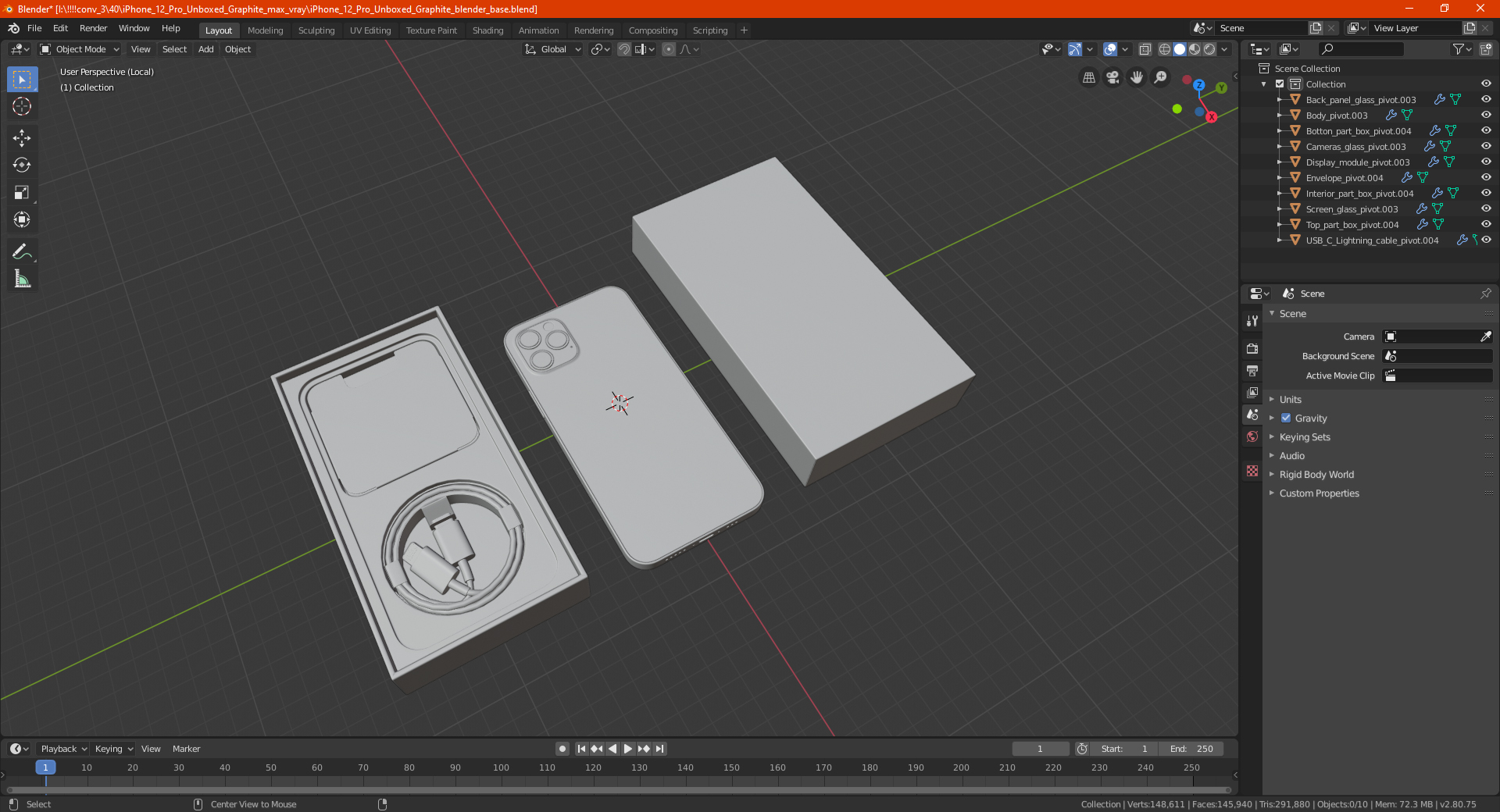 iPhone 12 Pro Unboxed Graphite is a high quality, photo real 3d model that will enhance detail and realism to any of your rendering projects. The model has a fully textured, detailed design that allows for close-up renders, and was originally modeled in 3ds Max 2020 and rendered with V-Ray. Renders have no postprocessing!