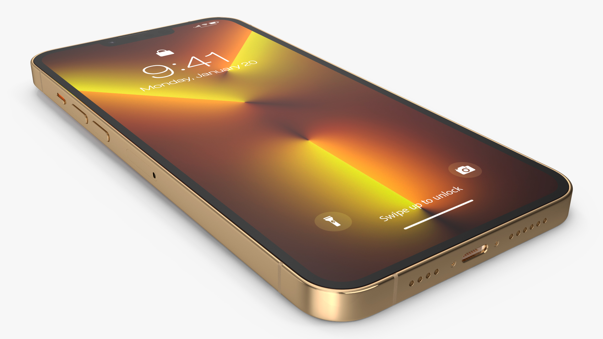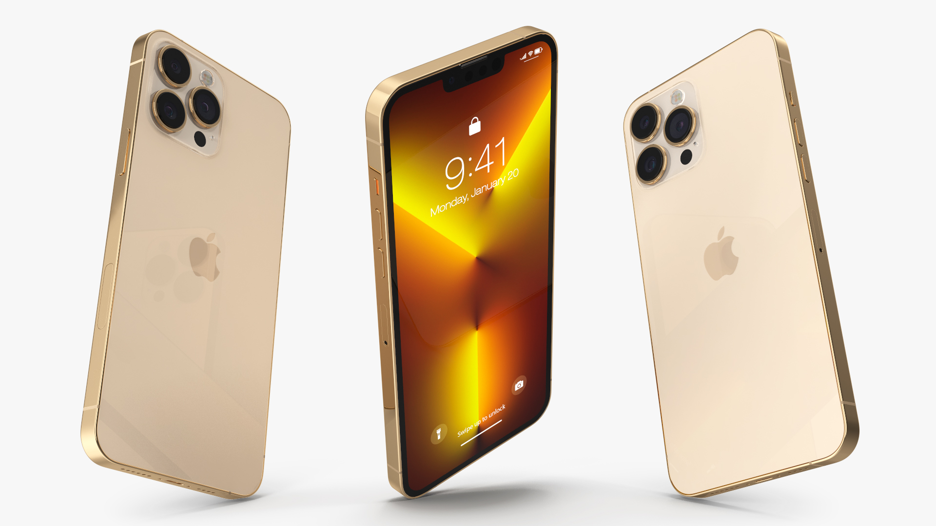 iPhone 13 Pro Max Gold is a three-dimensional model of an iOS compatible Apple smartphone gadget which is a fifteenth generation, large, luxury, flagship iPhone electronics device.