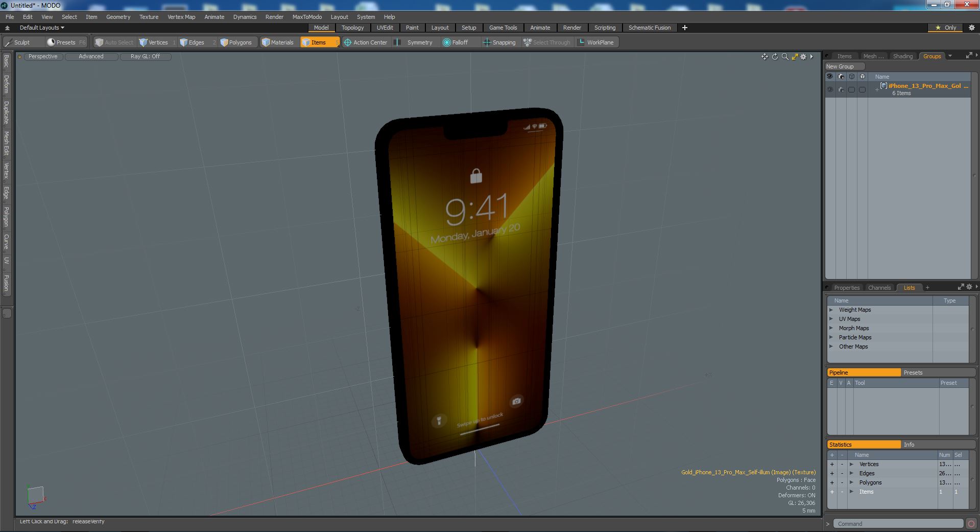 iPhone 13 Pro Max Gold is a high quality, photo real 3d model that will enhance detail and realism to any of your rendering projects. The model has a fully textured, detailed design that allows for close-up renders, and was originally modeled in 3ds Max 2020 and rendered with V-Ray. Renders have no postprocessing!