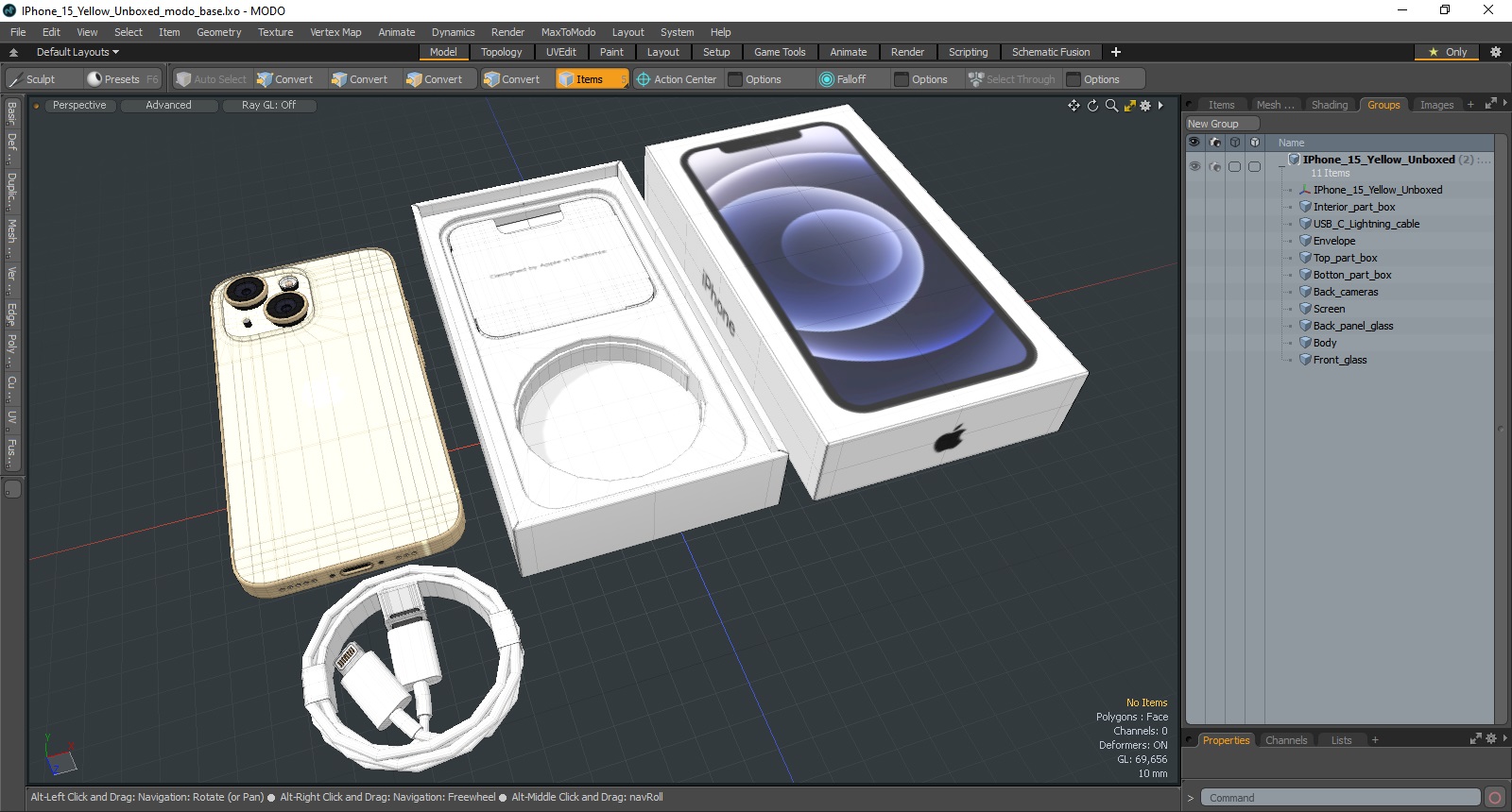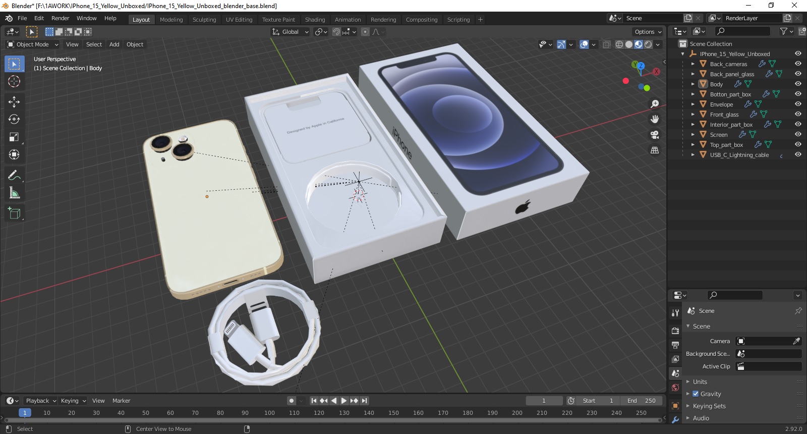IPhone 15 Yellow Unboxed is a high quality, photo real 3d model that will enhance detail and realism to any of your rendering projects. The model has a fully textured, detailed design that allows for close-up renders, and was originally modeled in 3ds Max 2020 and rendered with V-Ray. Renders have no postprocessing!