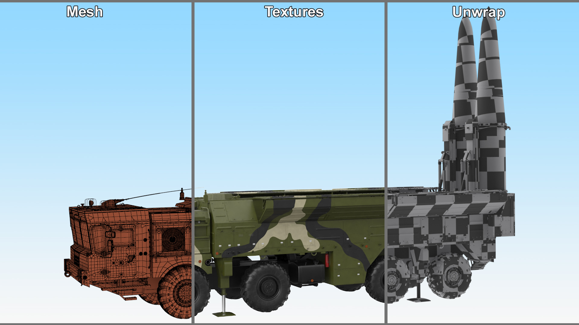 Iskander SS-26 Stone in Camouflage Coloring in Combat Readiness is a high quality, photo real 3d model that will enhance detail and realism to any of your rendering projects. The model has a fully textured, detailed design that allows for close-up renders, and was originally modeled in 3ds Max 2020 and rendered with V-Ray. Renders have no postprocessing!