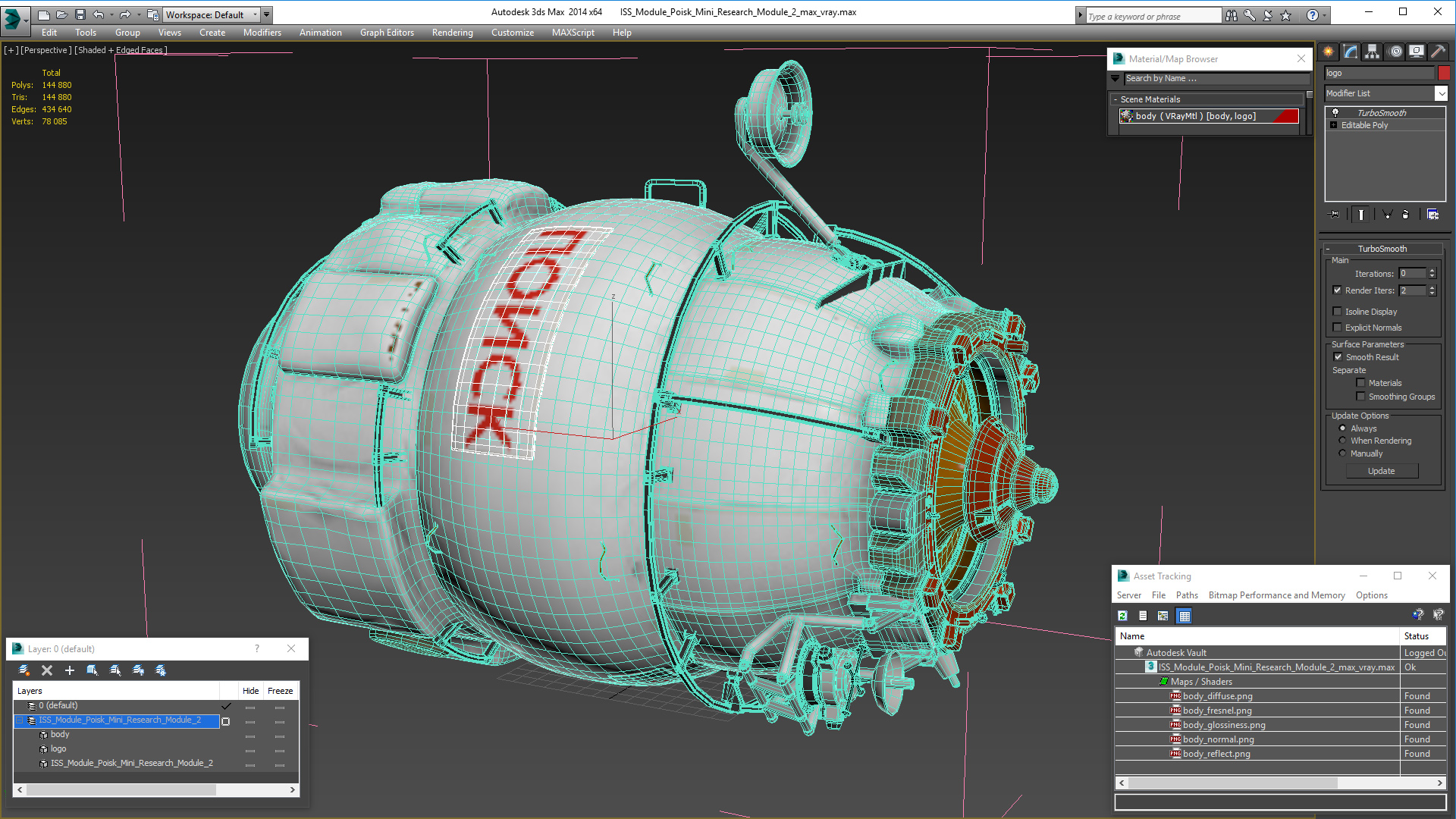 ISS Module Poisk Mini Research Module 2 is a high quality, photo real 3d model that will enhance detail and realism to any of your rendering projects. The model has a fully textured, detailed design that allows for close-up renders, and was originally modeled in 3ds Max 2020 and rendered with V-Ray. Renders have no postprocessing!