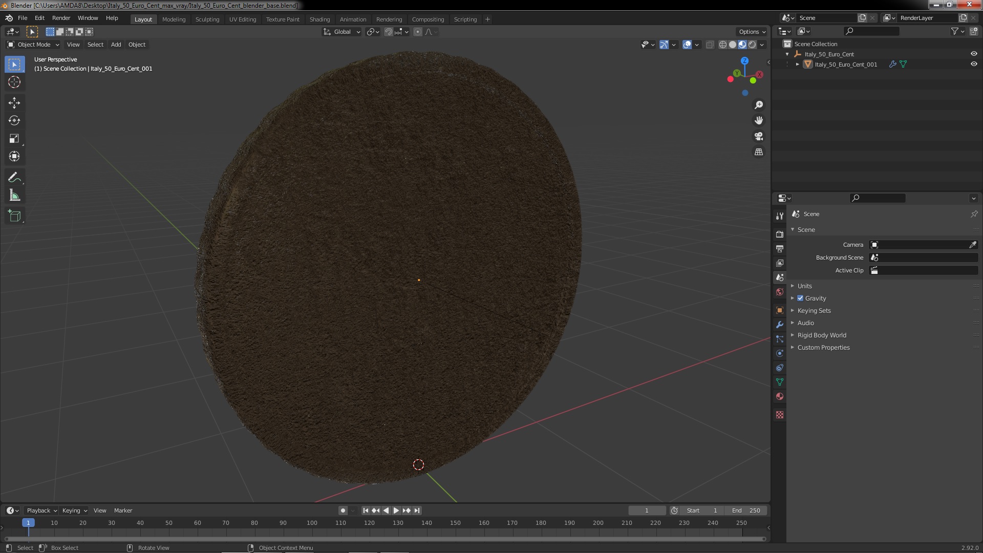 Italy 50 Euro Cent is a high quality, photo real 3d model that will enhance detail and realism to any of your rendering projects. The model has a fully textured, detailed design that allows for close-up renders, and was originally modeled in 3ds Max 2020 and rendered with V-Ray. Renders have no postprocessing!