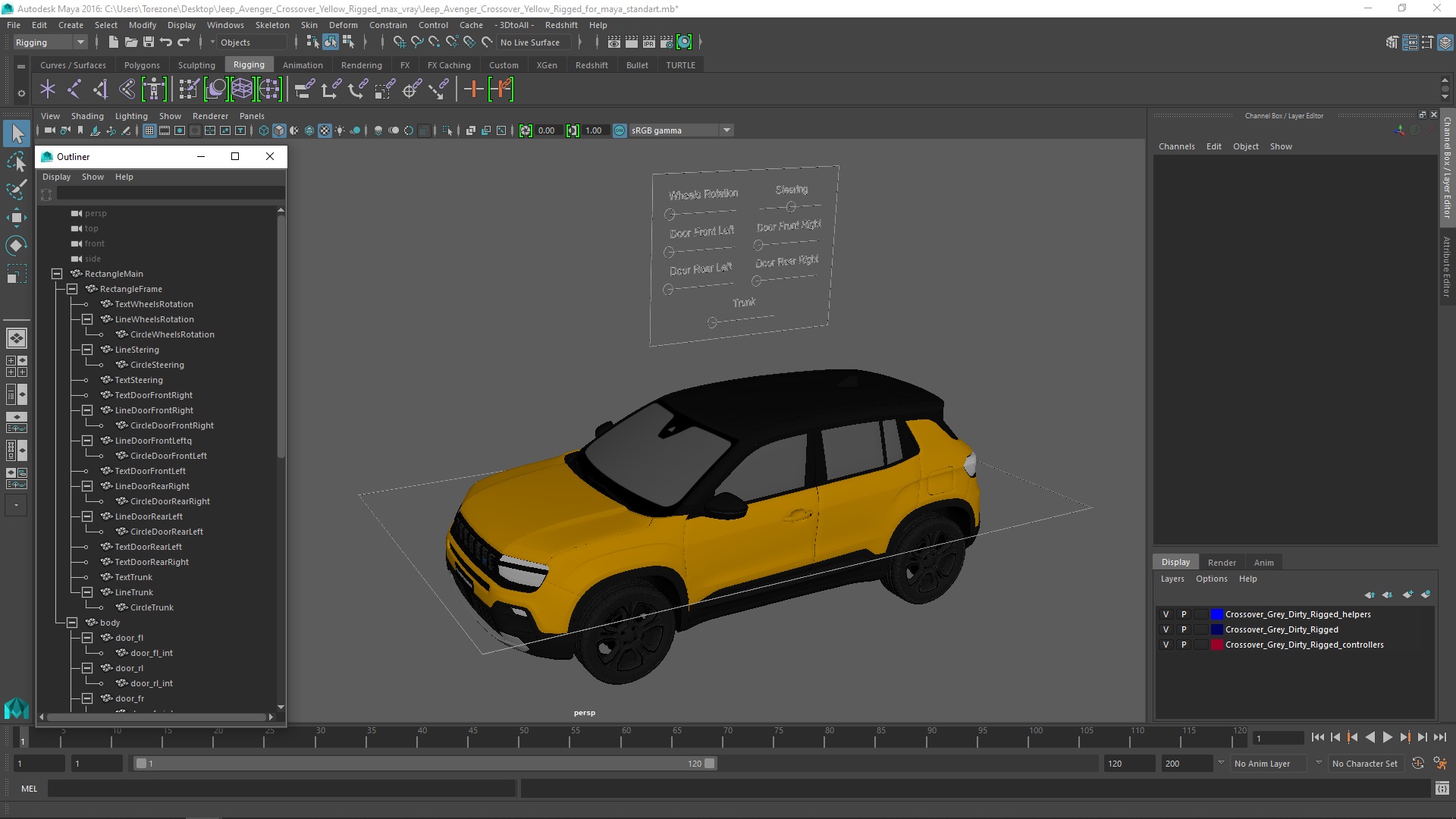 Jeep Avenger Crossover Yellow Rigged for Maya is fully rigged and is ready to be animated in Maya. You can easily position it the way you need or animate it the way your project requires. See the screenshots to get an idea of how rigging works. The pose of the model on the render images is an example and can be recreated using rig, it is not initially included into the product.
