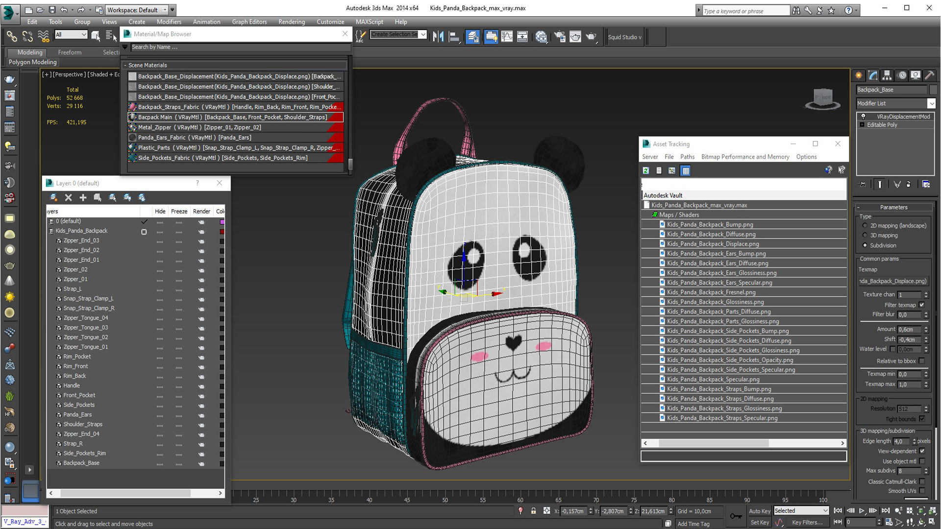 Kids Panda Backpack is a high quality, photo real 3d model that will enhance detail and realism to any of your rendering projects. The model has a fully textured, detailed design that allows for close-up renders, and was originally modeled in 3ds Max 2020 and rendered with V-Ray. Renders have no postprocessing!