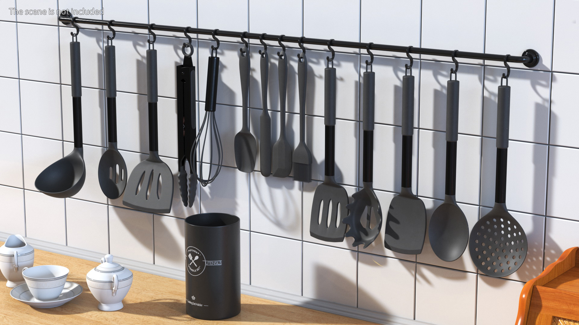 Kitchenware Set with Holder Metallic Black is a three-dimensional model of kitchen tableware with spoon, dessert spoon, ladle, whisk, spatula, holder, pancake turner and more.