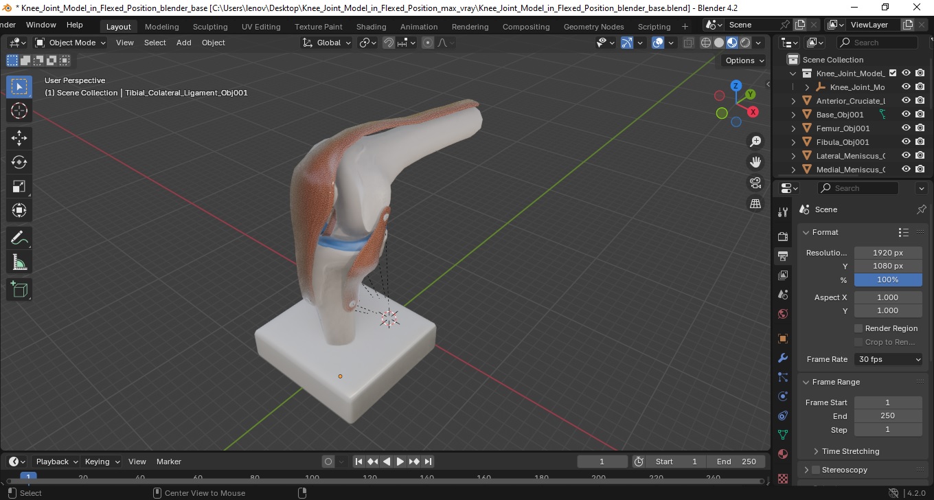 Knee Joint Model in Flexed Position is a three-dimensional model of human knee bones set that is a part of people skeleton framework bones structure, and that is a largest and complex joint in the human body.