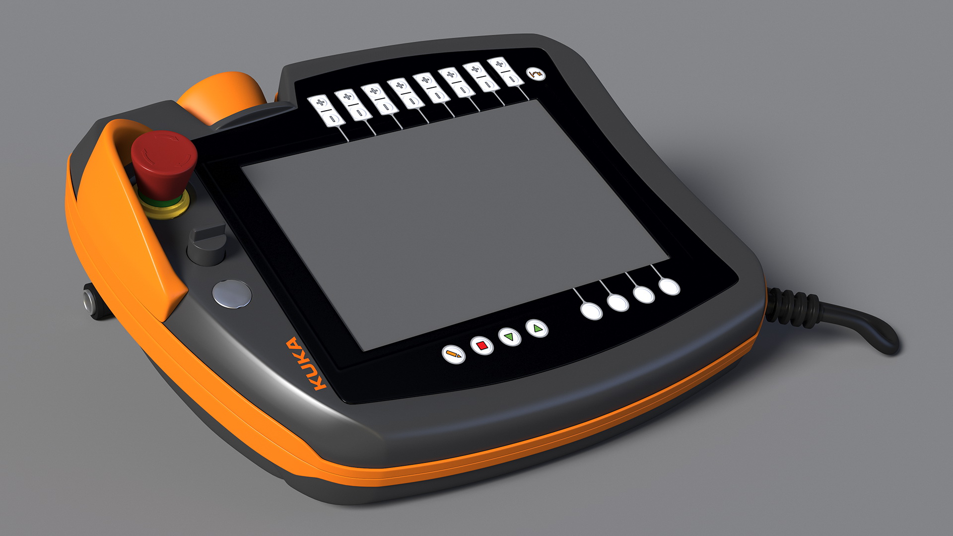 KUKA smartPAD is a 3d model of handheld device used to control and program KUKA industrial robots.