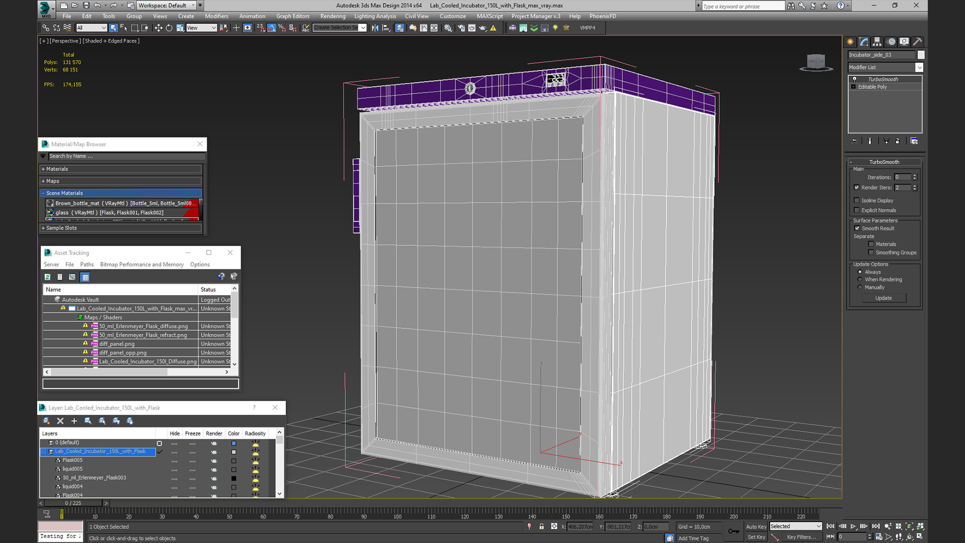 Lab Cooled Incubator 150L with Flask is a high quality, photo real 3d model that will enhance detail and realism to any of your rendering projects. The model has a fully textured, detailed design that allows for close-up renders, and was originally modeled in 3ds Max 2020 and rendered with V-Ray. Renders have no postprocessing!