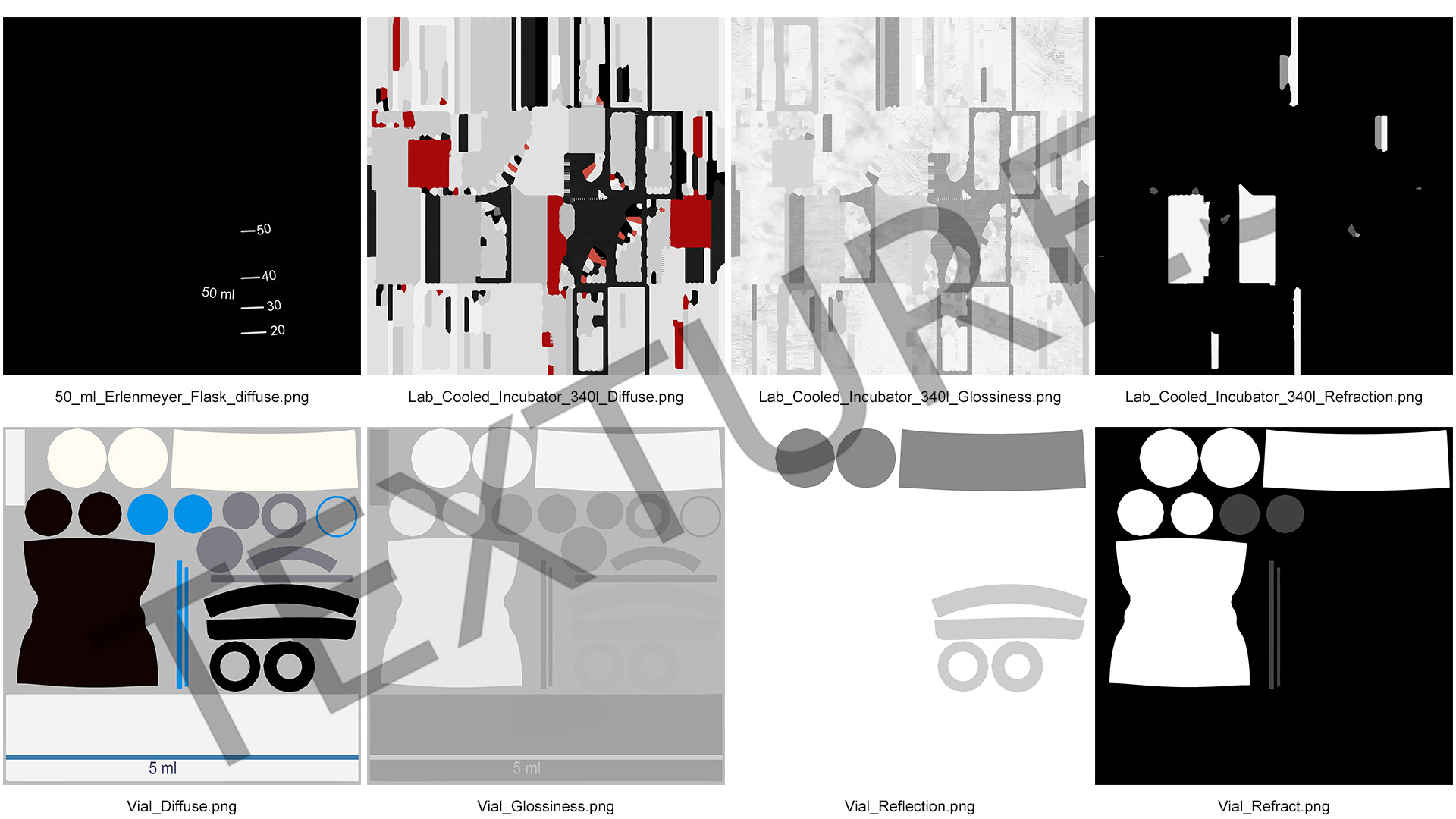 All textures and materials are included and mapped. (All colors can be easily modified.)