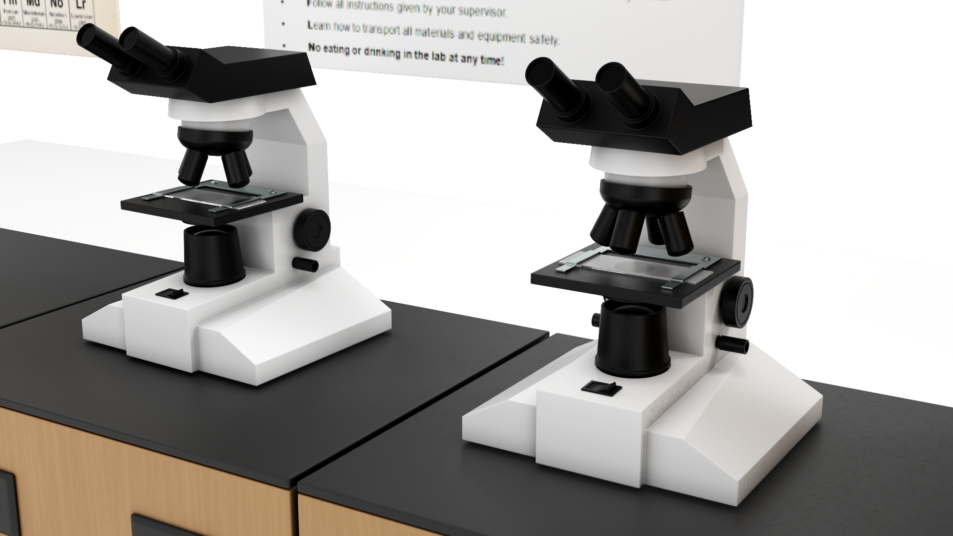 Laboratory Interior with Cabinets and Microscopes is a three-dimensional model of school laboratory interior with special chemistry equipment items, cabinets, and furniture.