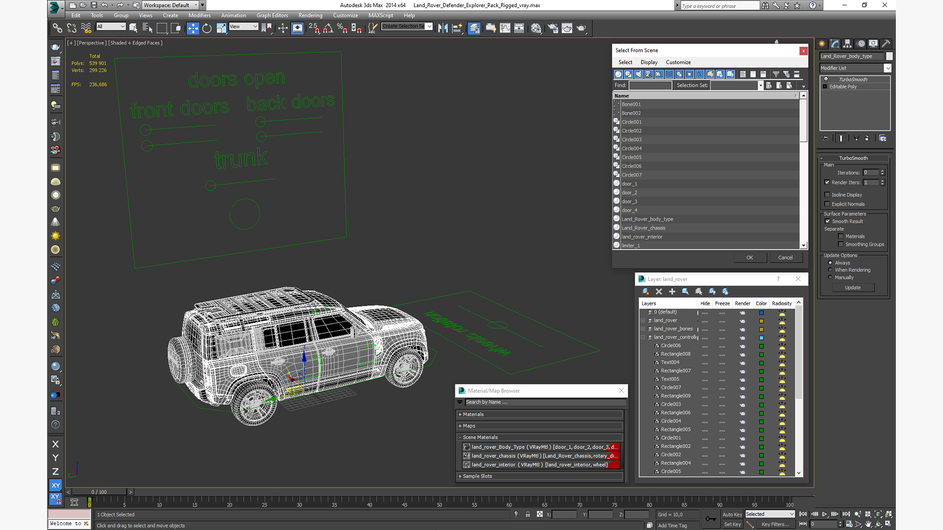 Land Rover Defender Explorer Pack Rigged is fully rigged and is ready to be animated. You can easily position it the way you need or animate it the way your project requires using helpers in 3D Studio Max. See the turntable to get an idea of how rigging works.