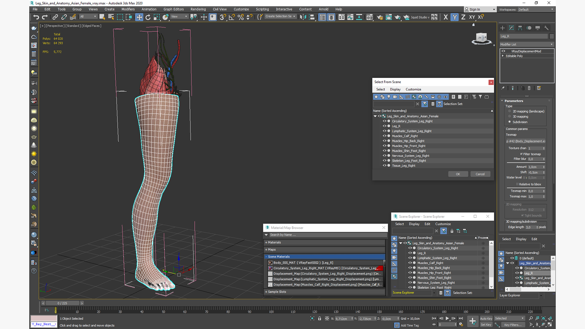 Leg Skin and Anatomy Asian Female is a high quality, photo real 3d model that will enhance detail and realism to any of your rendering projects. The model has a fully textured, detailed design that allows for close-up renders, and was originally modeled in 3ds Max 2020 and rendered with V-Ray. Renders have no postprocessing!