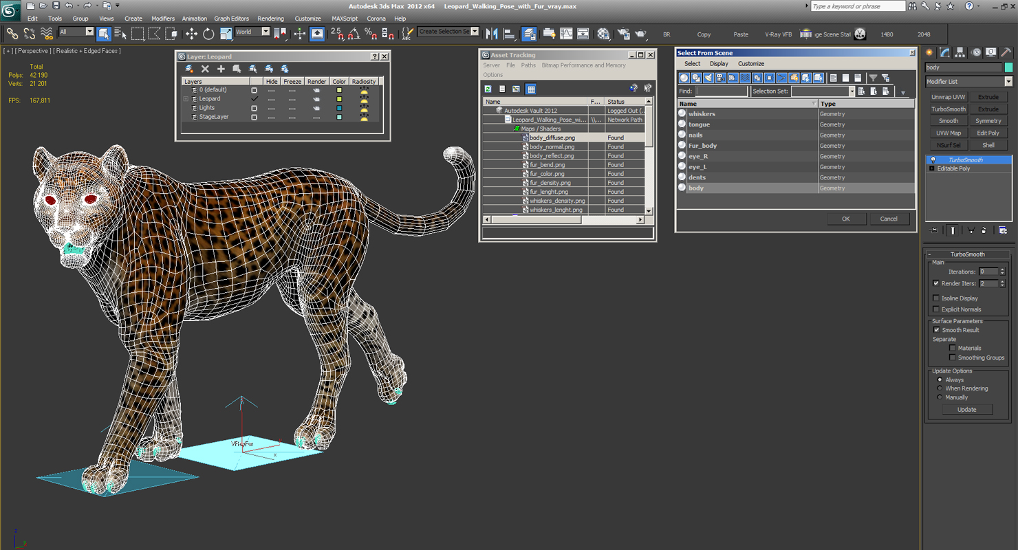 Leopard Walking Pose with Fur has a 3dsmax Fur modifier, hair customizable (hair count, hair segments, hair color, root size, tip size, etc).