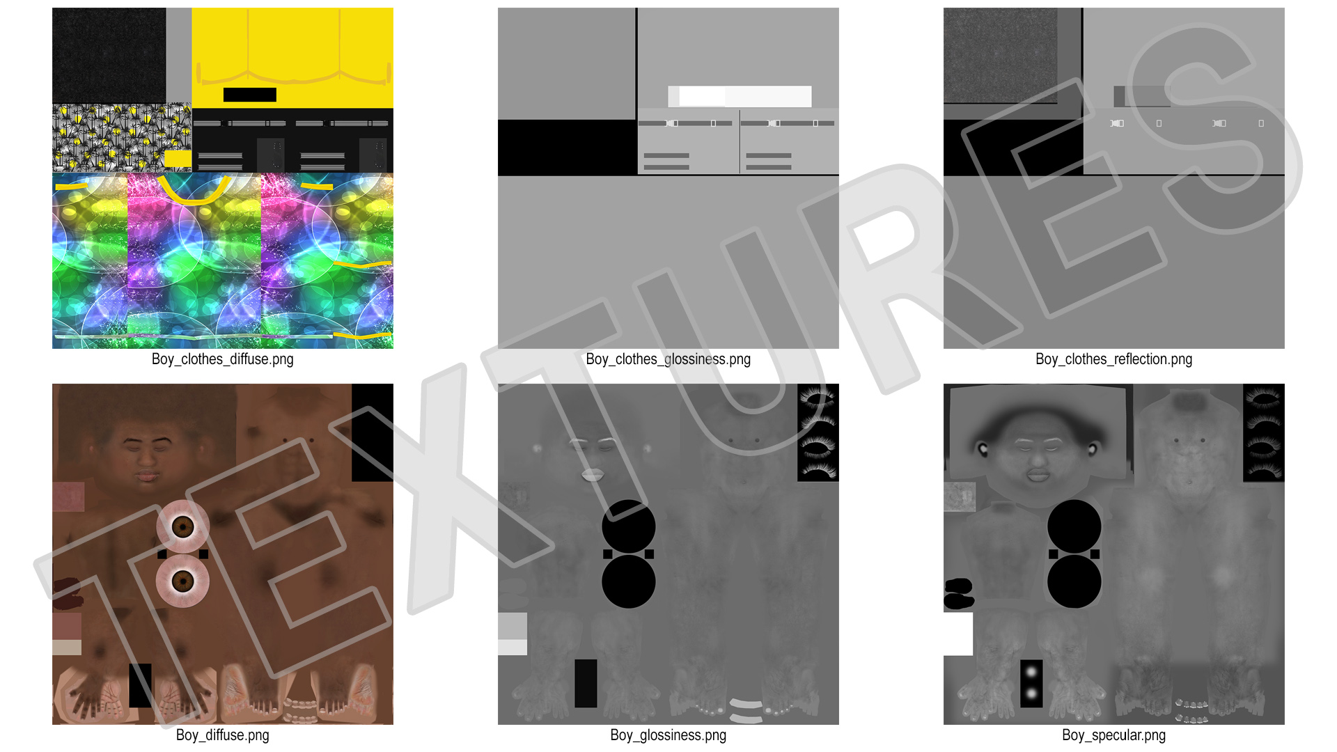 All textures and materials are included and mapped. (All colors can be easily modified.)