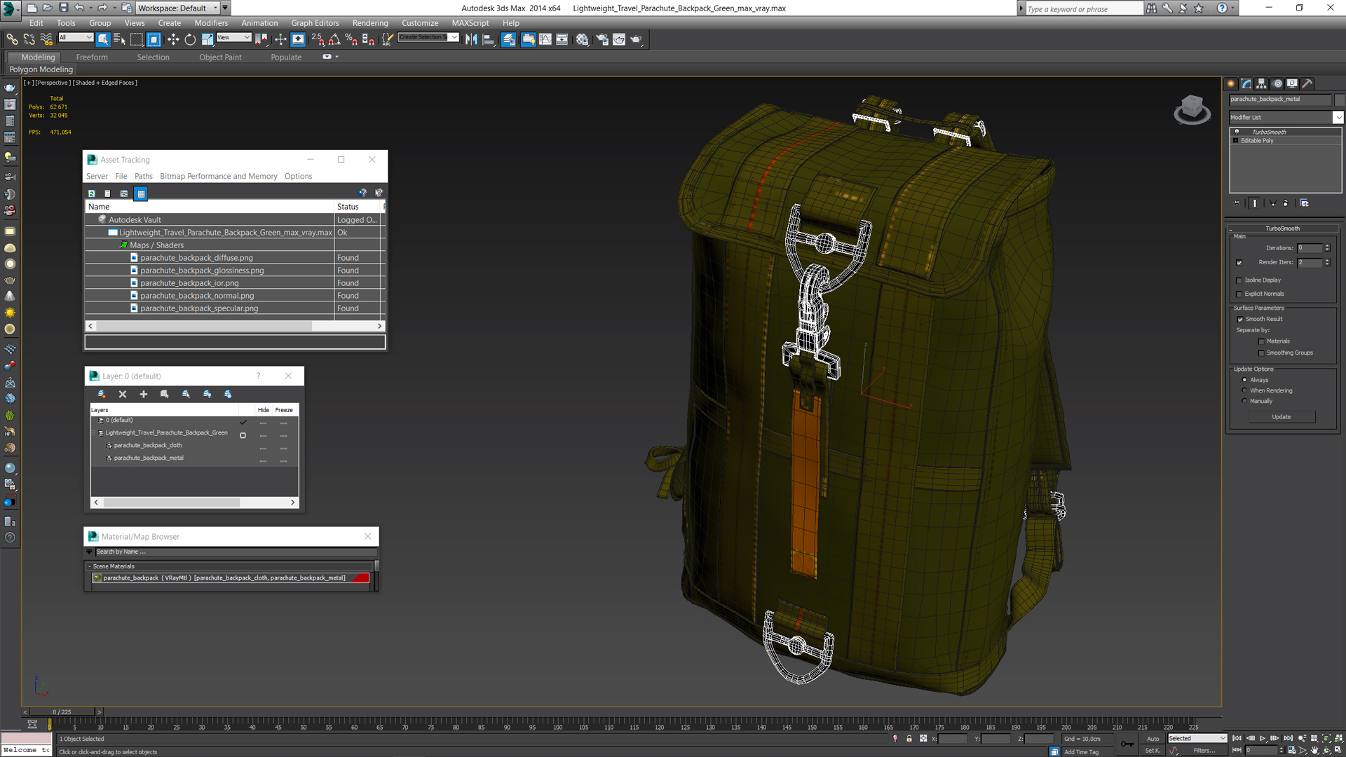 Lightweight Travel Parachute Backpack Green is a high quality, photo real 3d model that will enhance detail and realism to any of your rendering projects. The model has a fully textured, detailed design that allows for close-up renders, and was originally modeled in 3ds Max 2020 and rendered with V-Ray. Renders have no postprocessing!