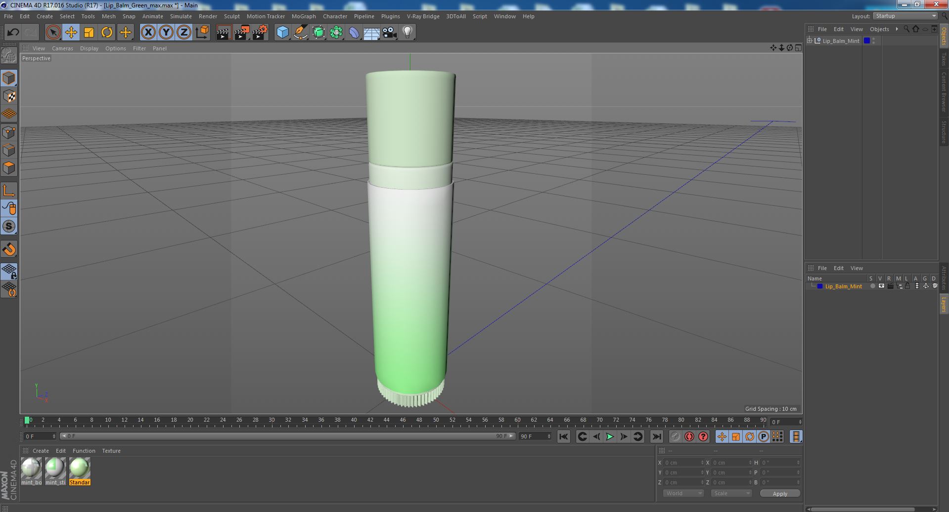 Lip Balm Green is a three-dimensional model of a popular wax-like product applied to the human lips to skin moisturize effect.