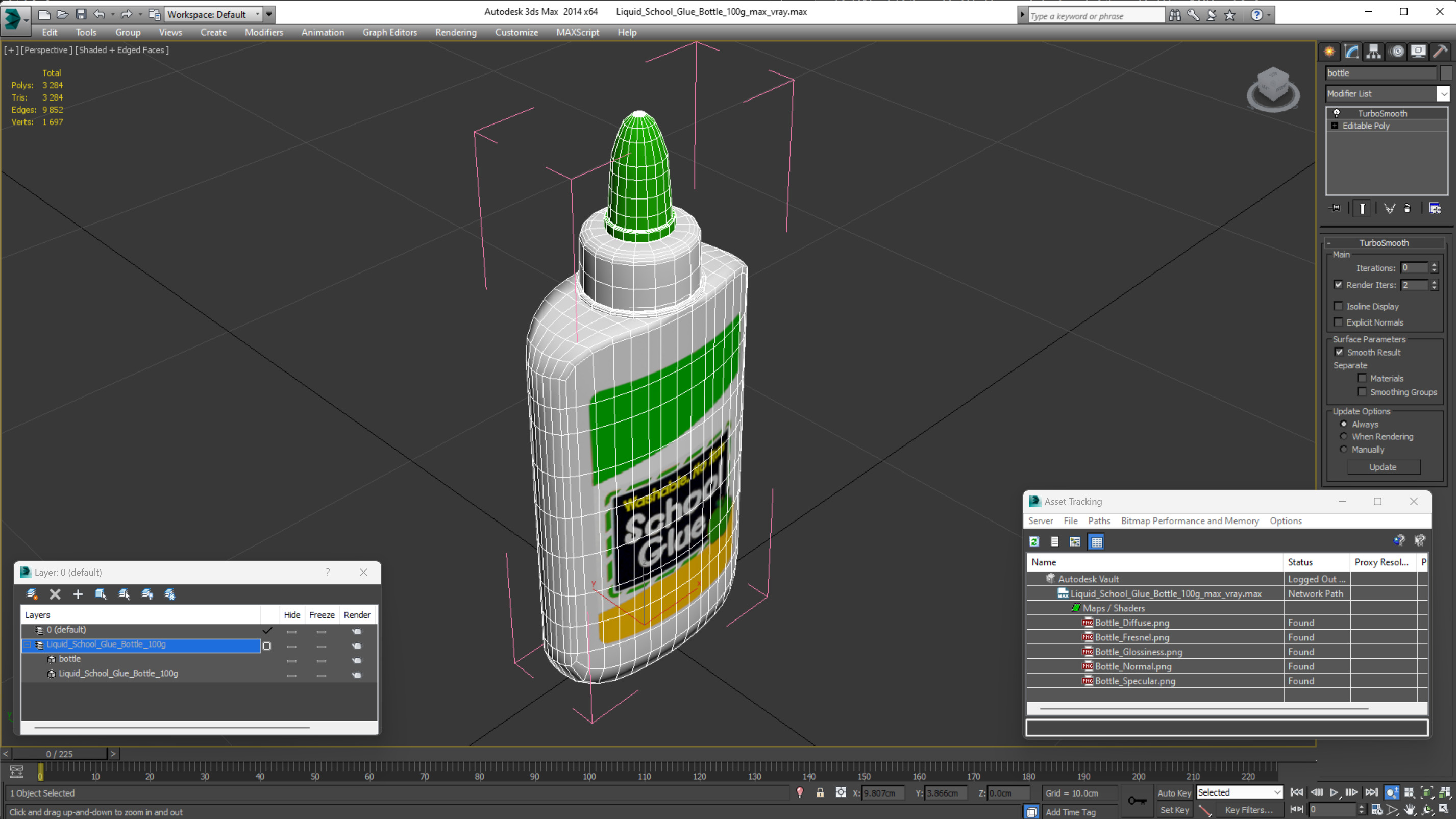 Liquid School Glue Bottle 100g is a high quality, photo real 3d model that will enhance detail and realism to any of your rendering projects. The model has a fully textured, detailed design that allows for close-up renders, and was originally modeled in 3ds Max 2020 and rendered with V-Ray. Renders have no postprocessing!