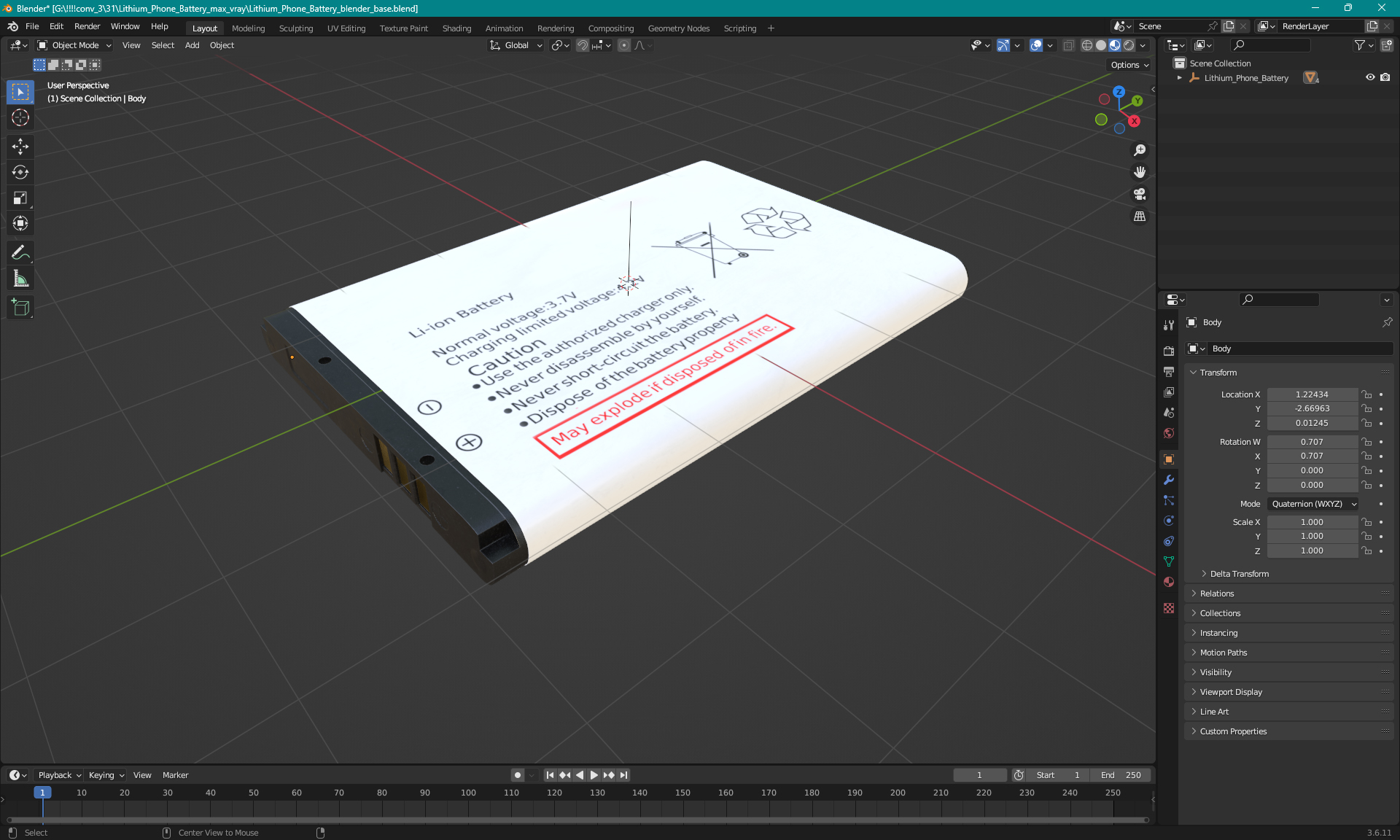 Lithium Phone Battery is a high quality, photo real 3d model that will enhance detail and realism to any of your rendering projects. The model has a fully textured, detailed design that allows for close-up renders, and was originally modeled in 3ds Max 2020 and rendered with V-Ray. Renders have no postprocessing!