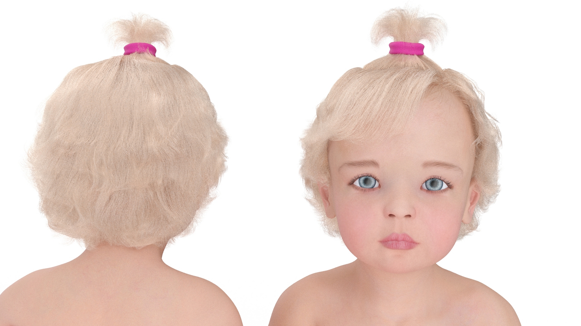 Little Girl on Potty Fur has a 3dsmax Fur modifier, hair customizable (hair count, hair segments, hair color, root size, tip size, etc).