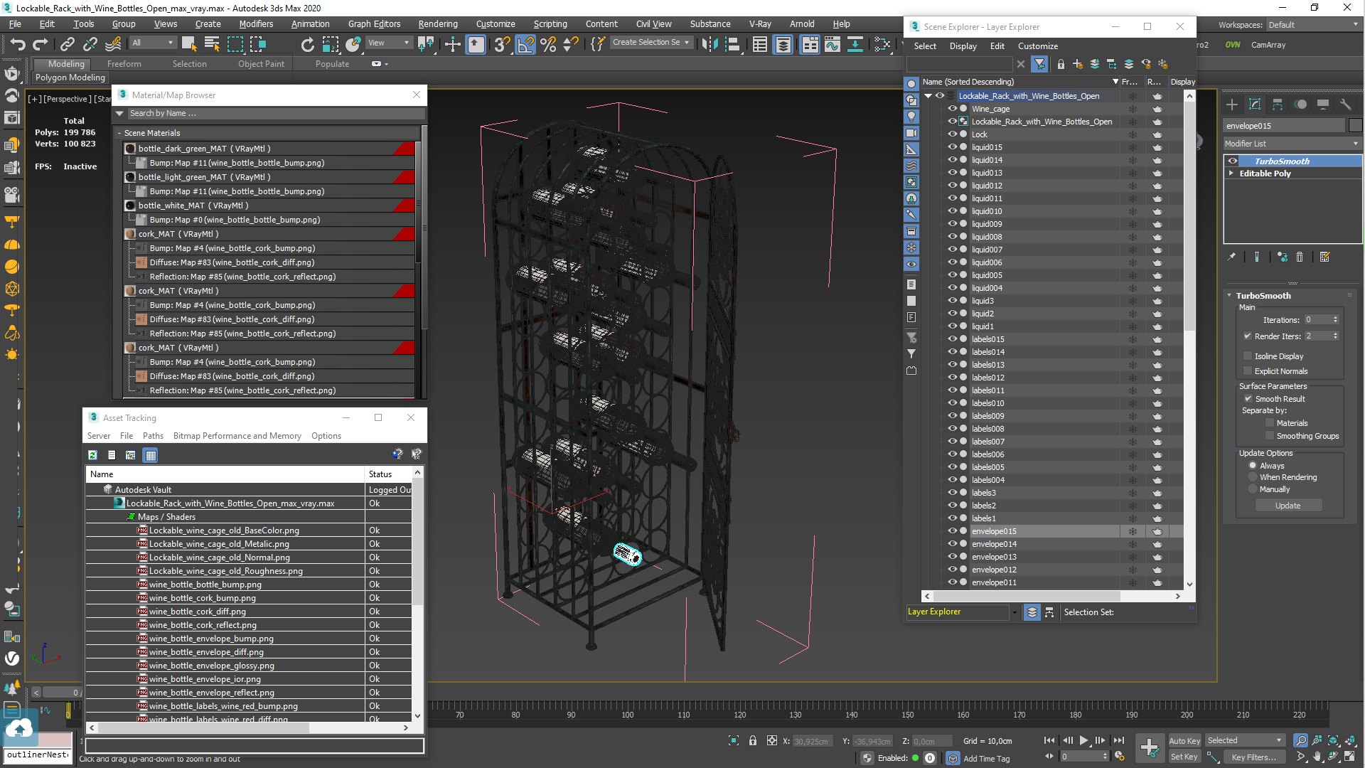 Lockable Rack with Wine Bottles Open is a high quality, photo real 3d model that will enhance detail and realism to any of your rendering projects. The model has a fully textured, detailed design that allows for close-up renders, and was originally modeled in 3ds Max 2020 and rendered with V-Ray. Renders have no postprocessing!