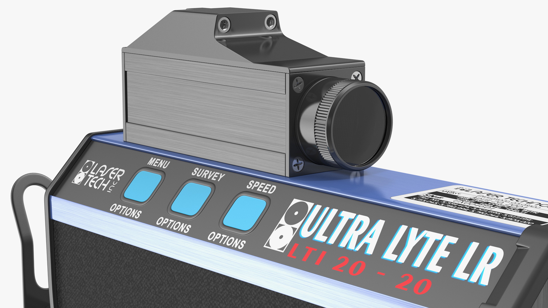 LTI UltraLyte LR 20 20 Laser Speed Gun street traffic police patrol speed measuring tool with streamlined and simplified menu options, rapid measurement updates, laser optics, handle, one-button weather filter, and flat membrane-style buttons.