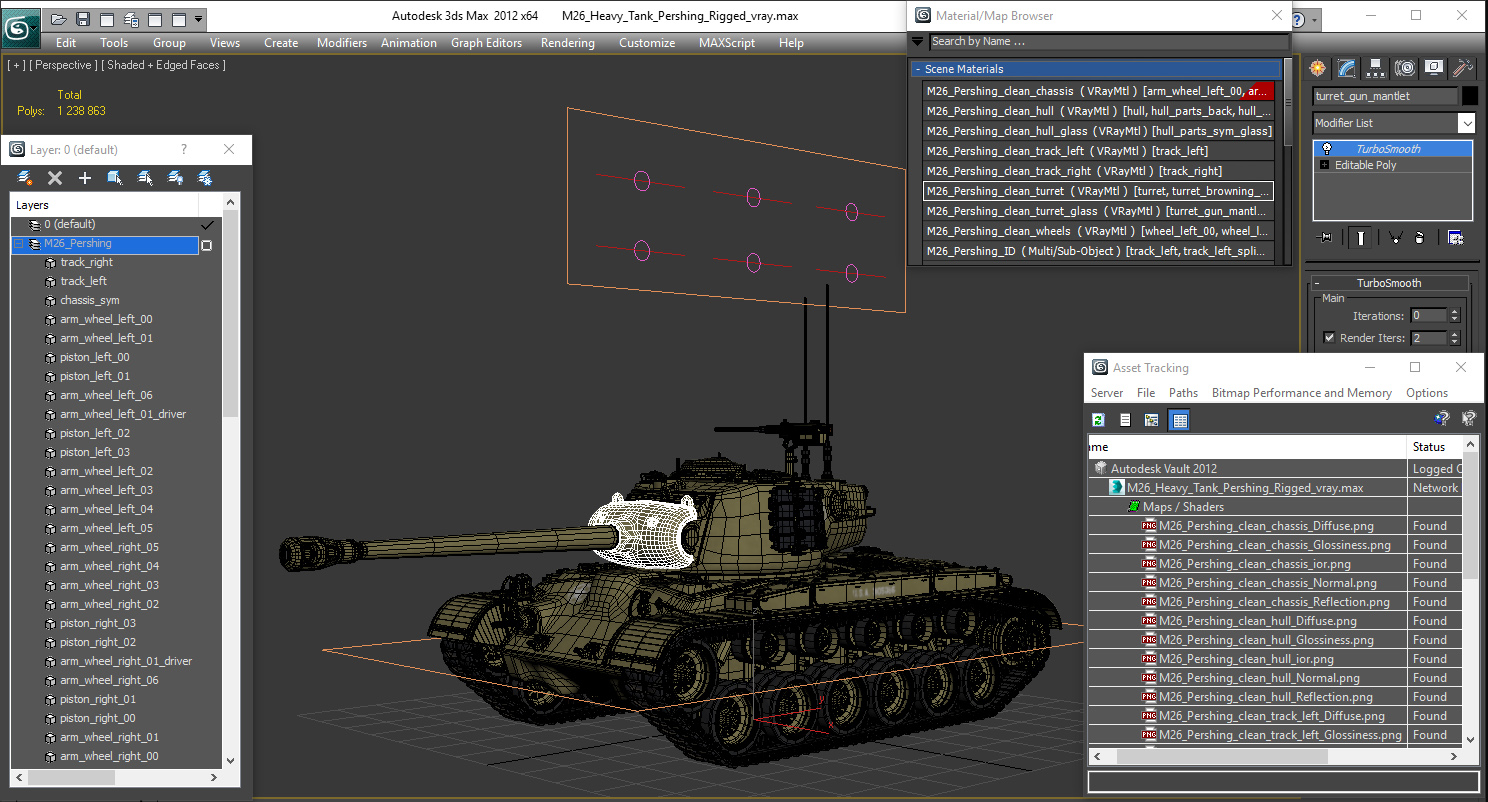 M26 Heavy Tank Pershing Rigged is fully rigged and is ready to be animated. You can easily position it the way you need or animate it the way your project requires using helpers in 3D Studio Max. See the turntable to get an idea of how rigging works.