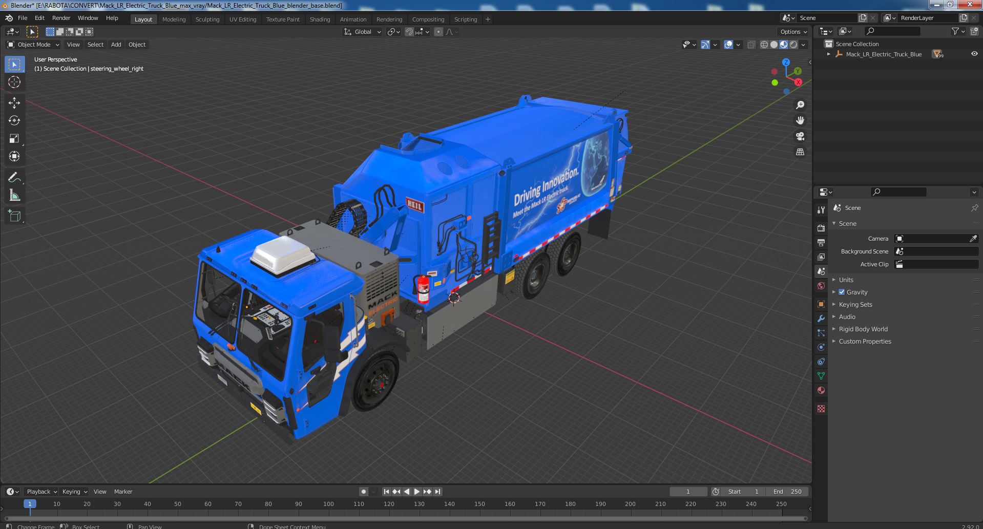 Mack LR Electric Truck Blue is a high quality, photo real 3d model that will enhance detail and realism to any of your rendering projects. The model has a fully textured, detailed design that allows for close-up renders, and was originally modeled in 3ds Max 2020 and rendered with V-Ray. Renders have no postprocessing!
