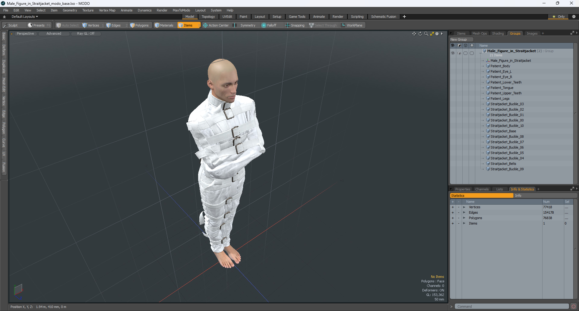 Male Figure in Straitjacket is a three-dimensional model of Caucasian (White) male character in a straitjacket, that is a strong garment with long sleeves which can be tied together to confine the arms of a violent prisoner or mental patient.