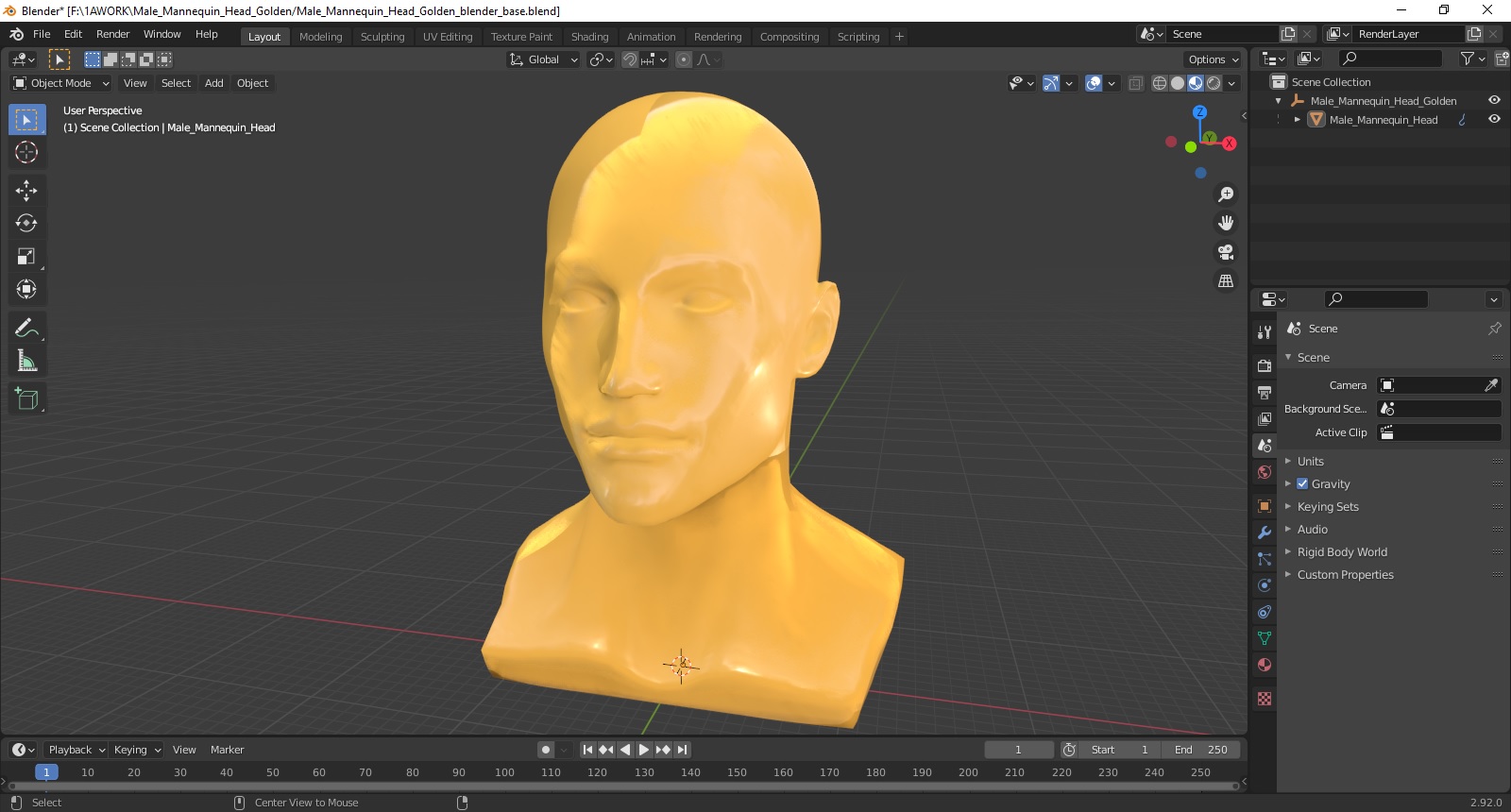 Male Mannequin Head Golden is a high quality, photo real 3d model that will enhance detail and realism to any of your rendering projects. The model has a fully textured, detailed design that allows for close-up renders, and was originally modeled in 3ds Max 2020 and rendered with V-Ray. Renders have no postprocessing!