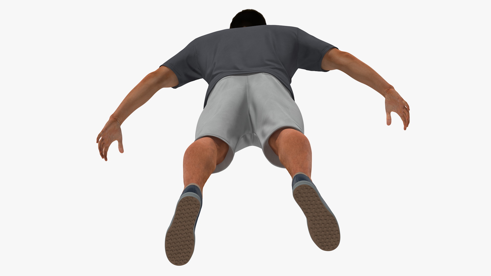 Civil man in ordinary urban style casual comfortable clothes with dark grey short-sleeved shirt, light grey knee-breeches and sneakers.