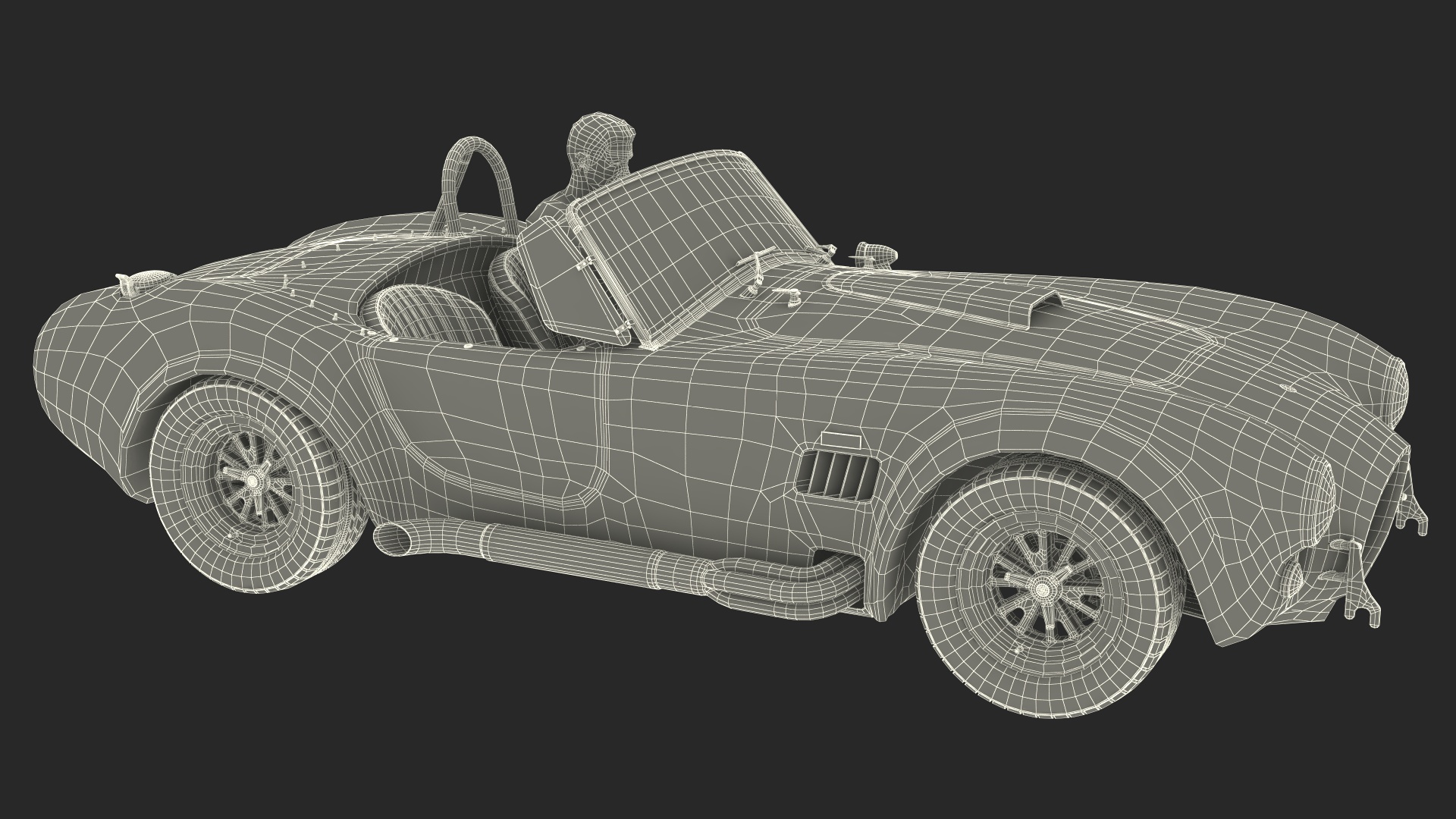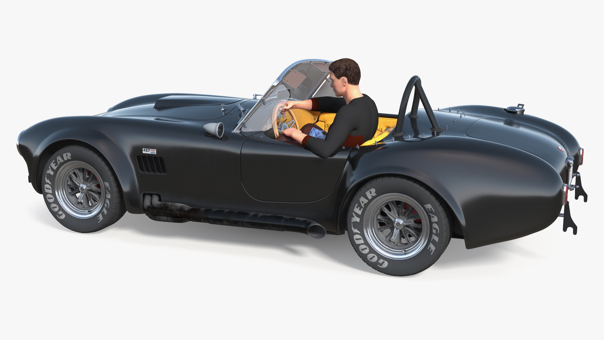 Man Driving Shelby Cobra 1965 is a 3d model of a driver behind the wheel of the classic Shelby Cobra 1965, capturing both the vehicle and its operator in a dynamic and realistic scene.