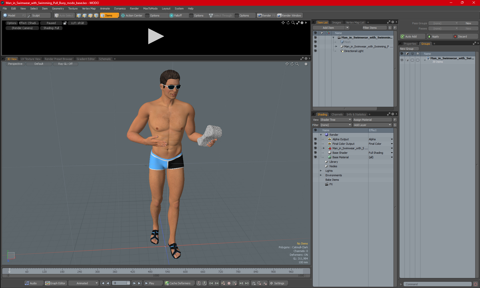 Man in Swimwear with Swimming Pull Buoy is a high quality, photo real 3d model that will enhance detail and realism to any of your rendering projects. The model has a fully textured, detailed design that allows for close-up renders, and was originally modeled in 3ds Max 2020 and rendered with V-Ray. Renders have no postprocessing!