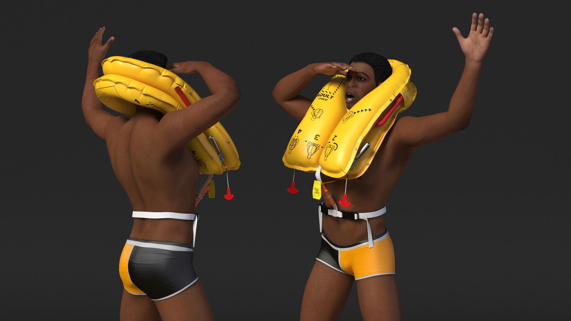Man with Life Jacket is a three-dimensional model of Black or Afro American male (man) character in the inflatable life vest, that is a buoyant rescue device designed for emergency situations at sea, river, lake or ocean.