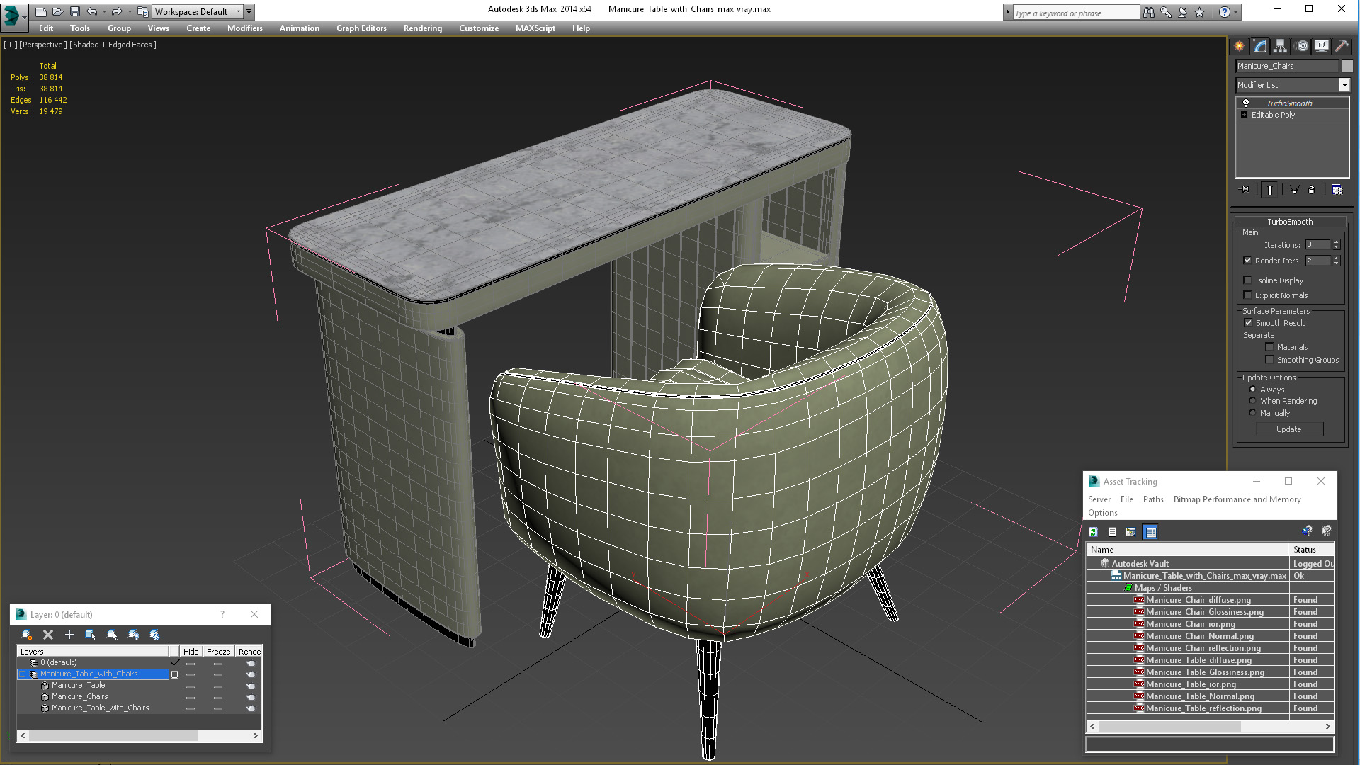 Manicure Table with Chairs is a high quality, photo real 3d model that will enhance detail and realism to any of your rendering projects. The model has a fully textured, detailed design that allows for close-up renders, and was originally modeled in 3ds Max 2020 and rendered with V-Ray. Renders have no postprocessing!