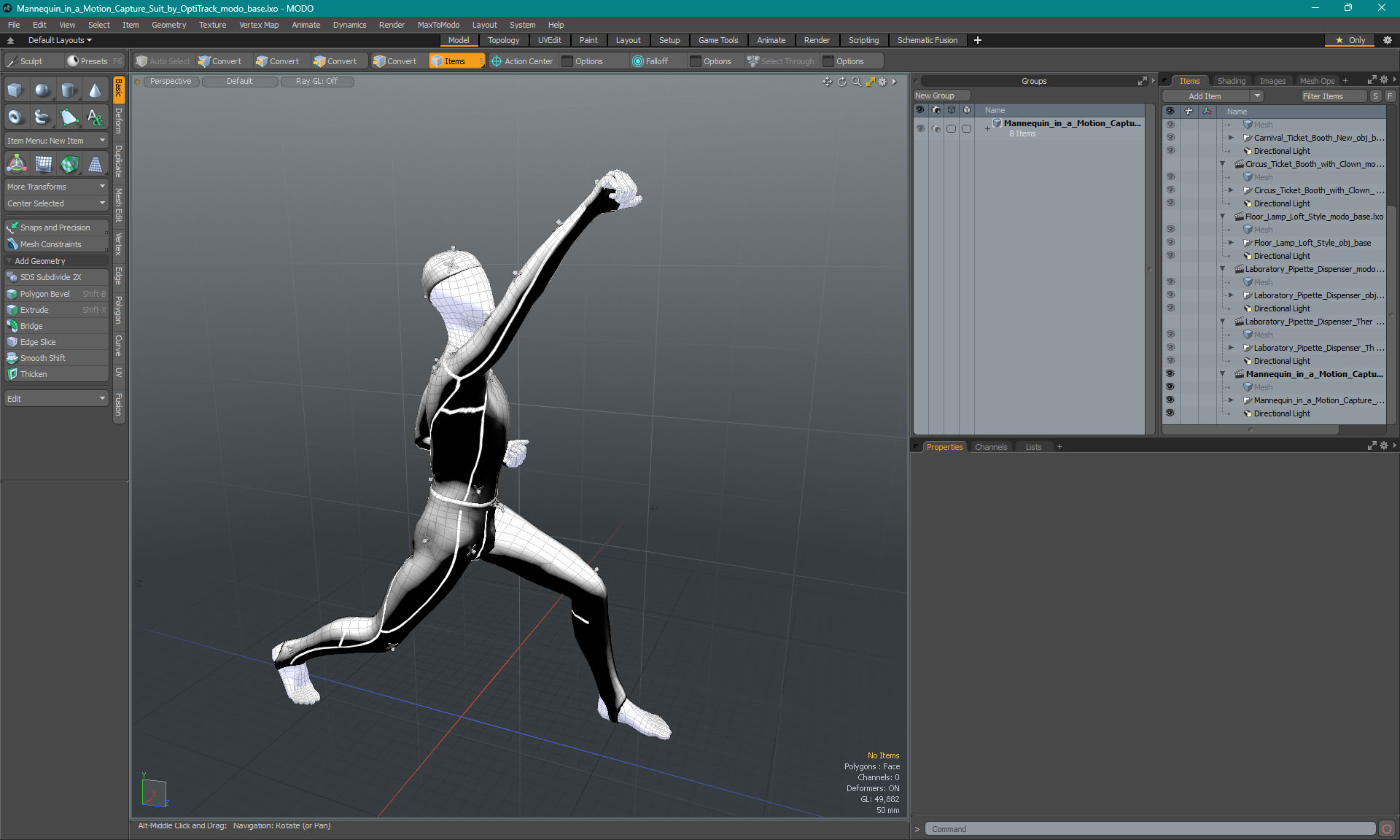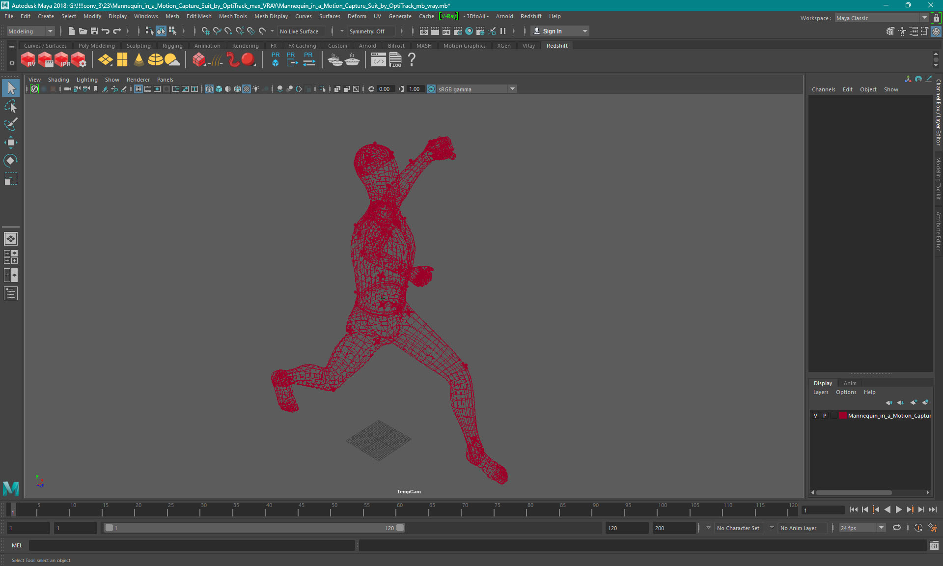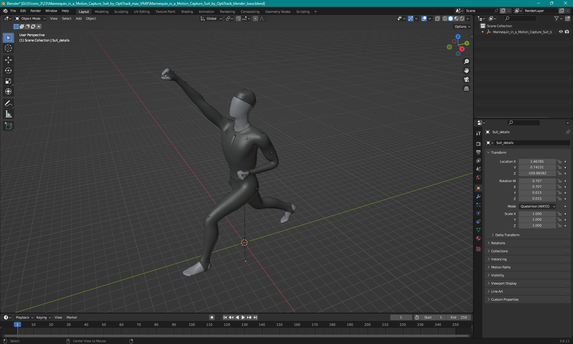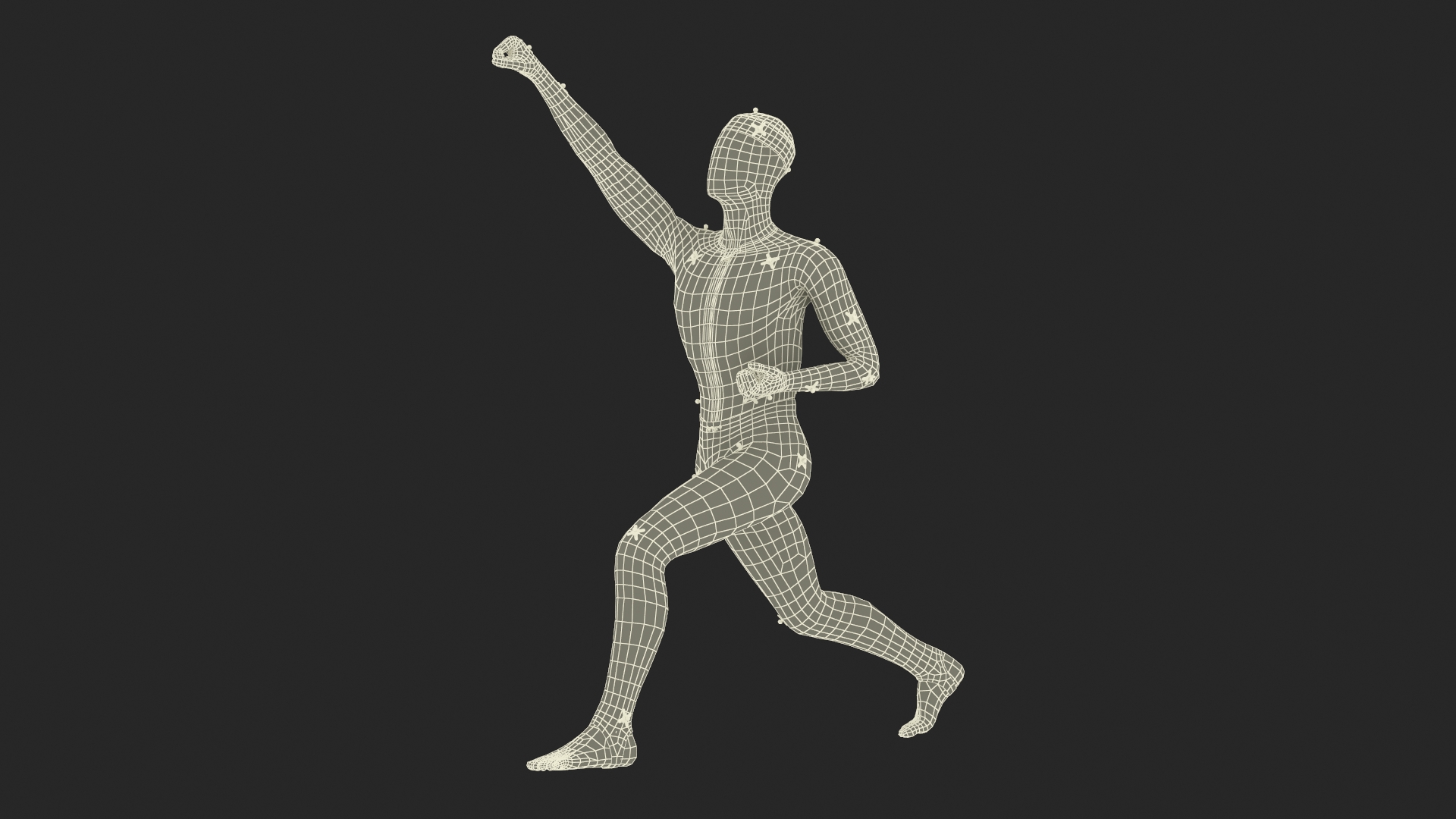 The model features a highly detailed mannequin wearing a motion capture suit designed by OptiTrack, with sensors accurately placed across the body to capture human movement with precision.