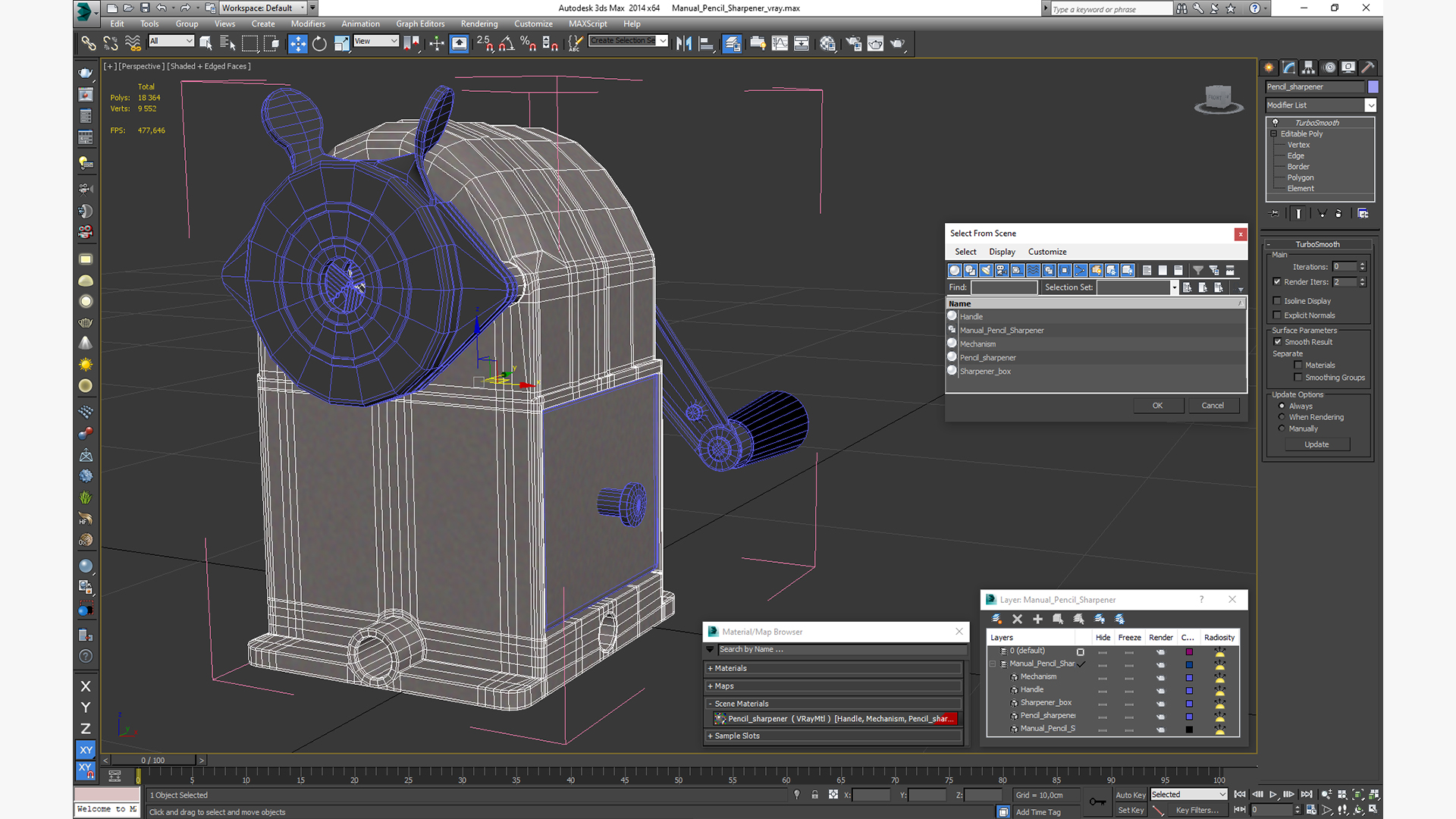 Manual Pencil Sharpener is a high quality, photo real 3d model that will enhance detail and realism to any of your rendering projects. The model has a fully textured, detailed design that allows for close-up renders, and was originally modeled in 3ds Max 2020 and rendered with V-Ray. Renders have no postprocessing!