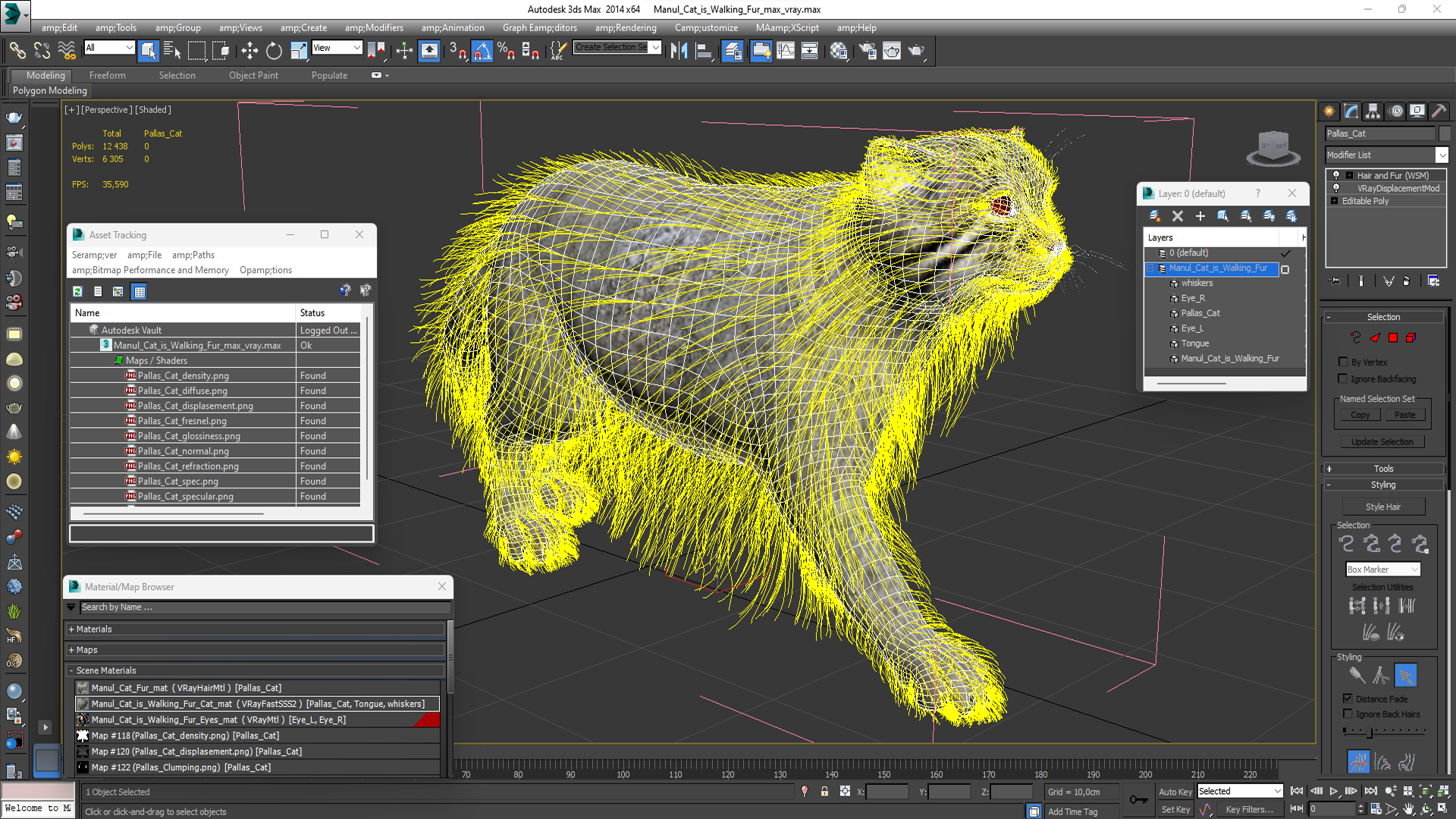 Manul Cat is Walking Fur has a 3dsmax Fur modifier, hair customizable (hair count, hair segments, hair color, root size, tip size, etc).