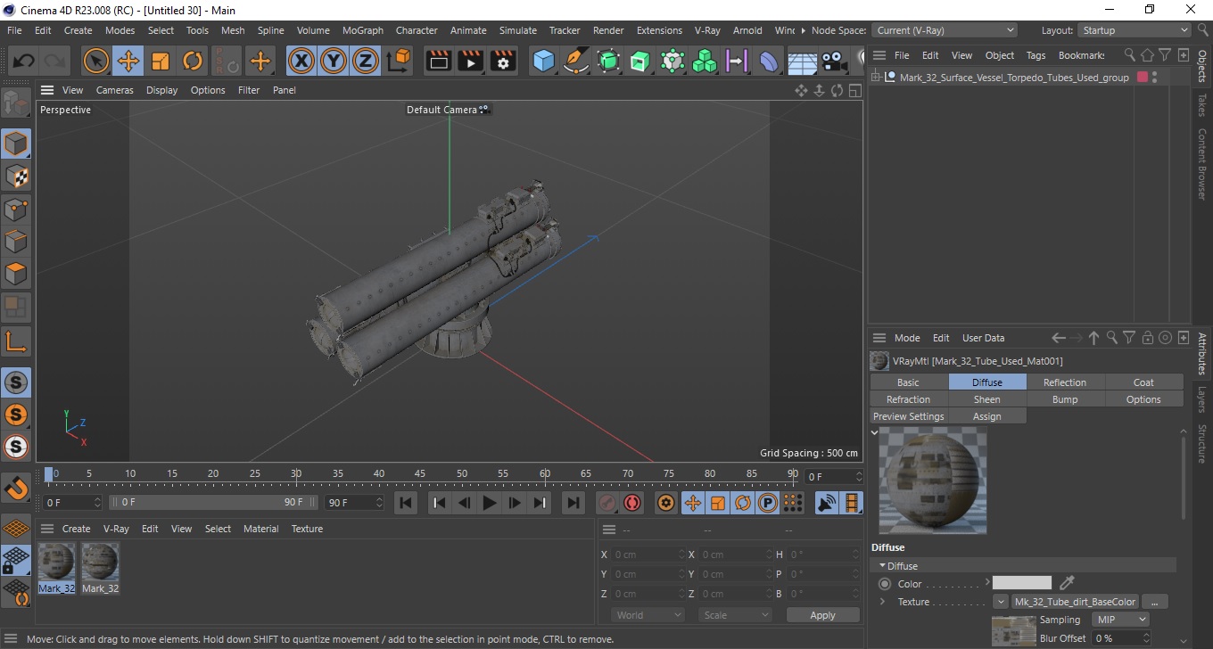 Mark 32 Surface Vessel Torpedo Tubes Used is a high quality, photo real 3d model that will enhance detail and realism to any of your rendering projects. The model has a fully textured, detailed design that allows for close-up renders, and was originally modeled in 3ds Max 2020 and rendered with V-Ray. Renders have no postprocessing!