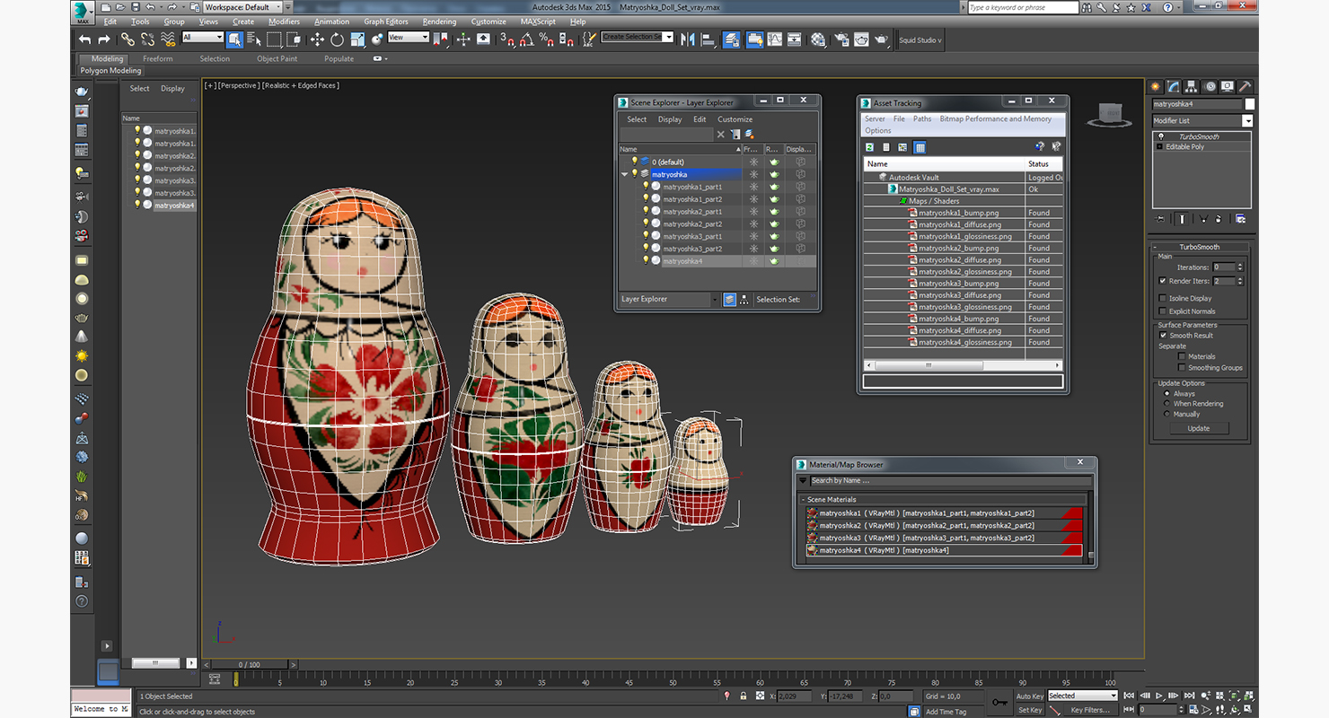 Matryoshka Doll Set is a high quality, photo real 3d model that will enhance detail and realism to any of your rendering projects. The model has a fully textured, detailed design that allows for close-up renders, and was originally modeled in 3ds Max 2020 and rendered with V-Ray. Renders have no postprocessing!