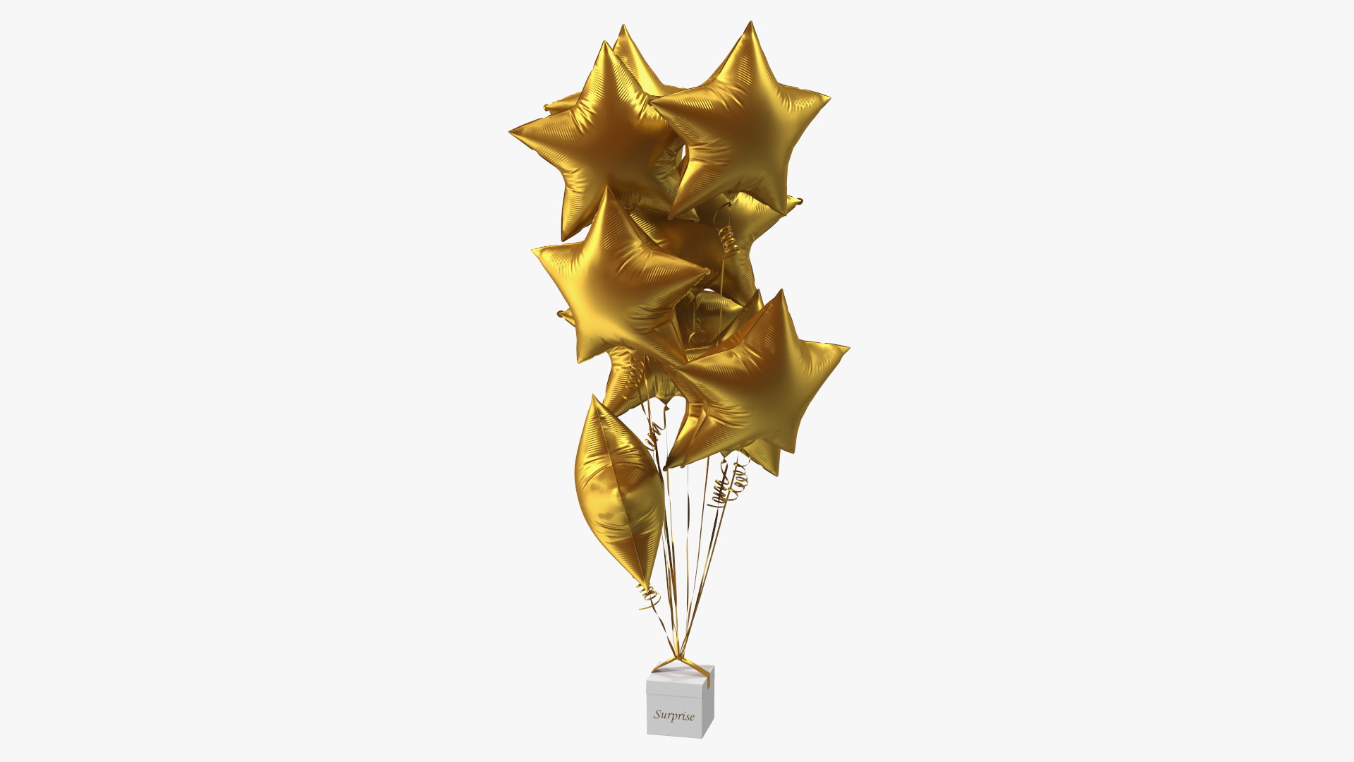 Matte Gold Star Balloons Tied to Gift Box is a three-dimensional model of a bunch of flying star-shaped balloons which are tied to a special square carton gift package.