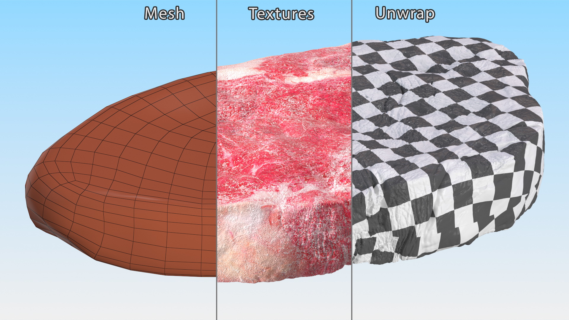 Meat Slice Frozen is a 3d model of piece of meat which has been frozen after slaughter to a temperature of minus 8 degrees Celsius or below.